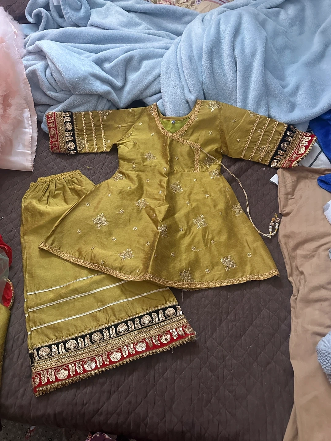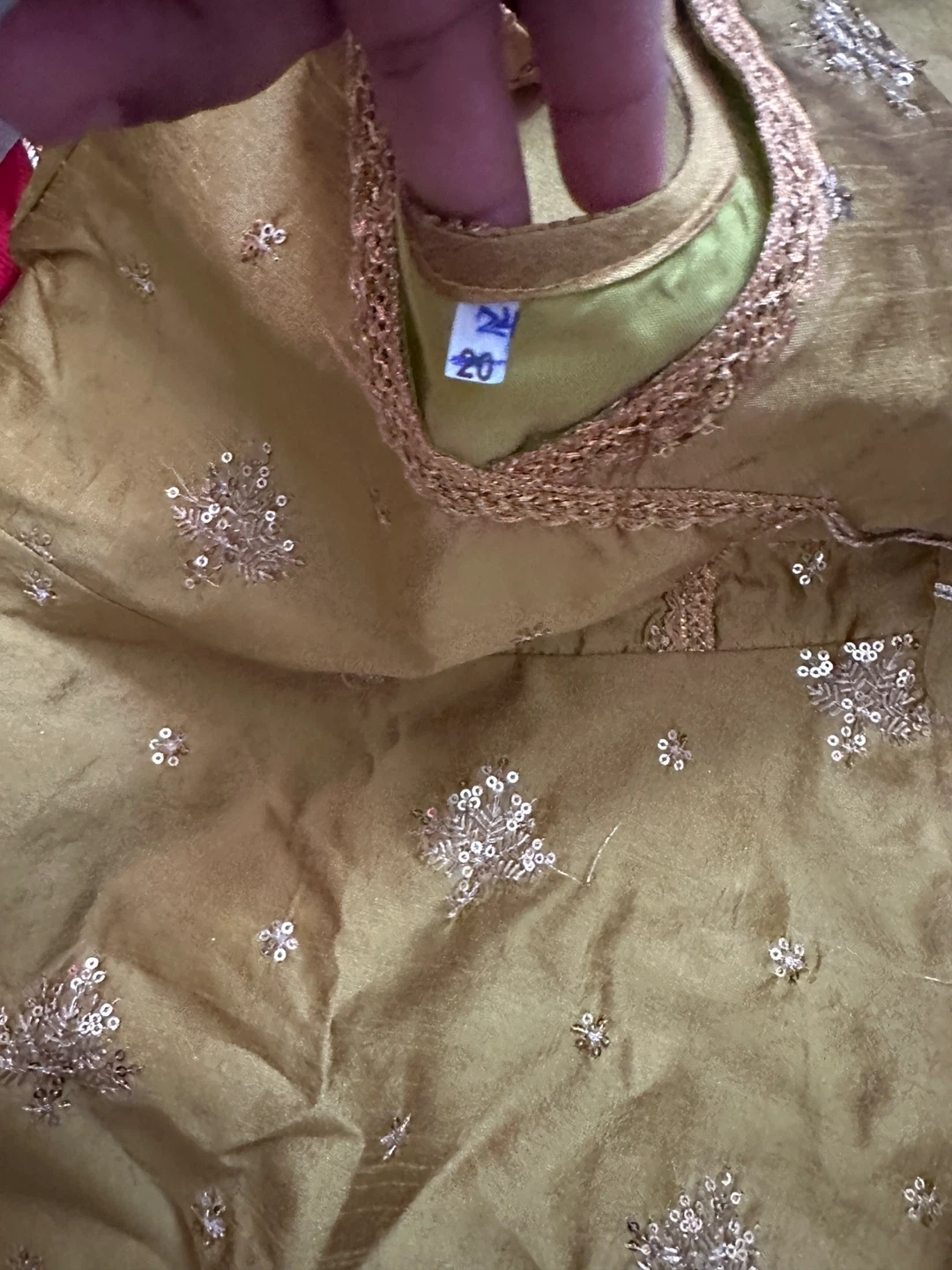 A lovely gold kurta pajama set for kids, adorned with intricate embroidery and sequin details. It features a comfortable wrap-style kurta and matching bottoms, perfect for special occasions. Size 20.