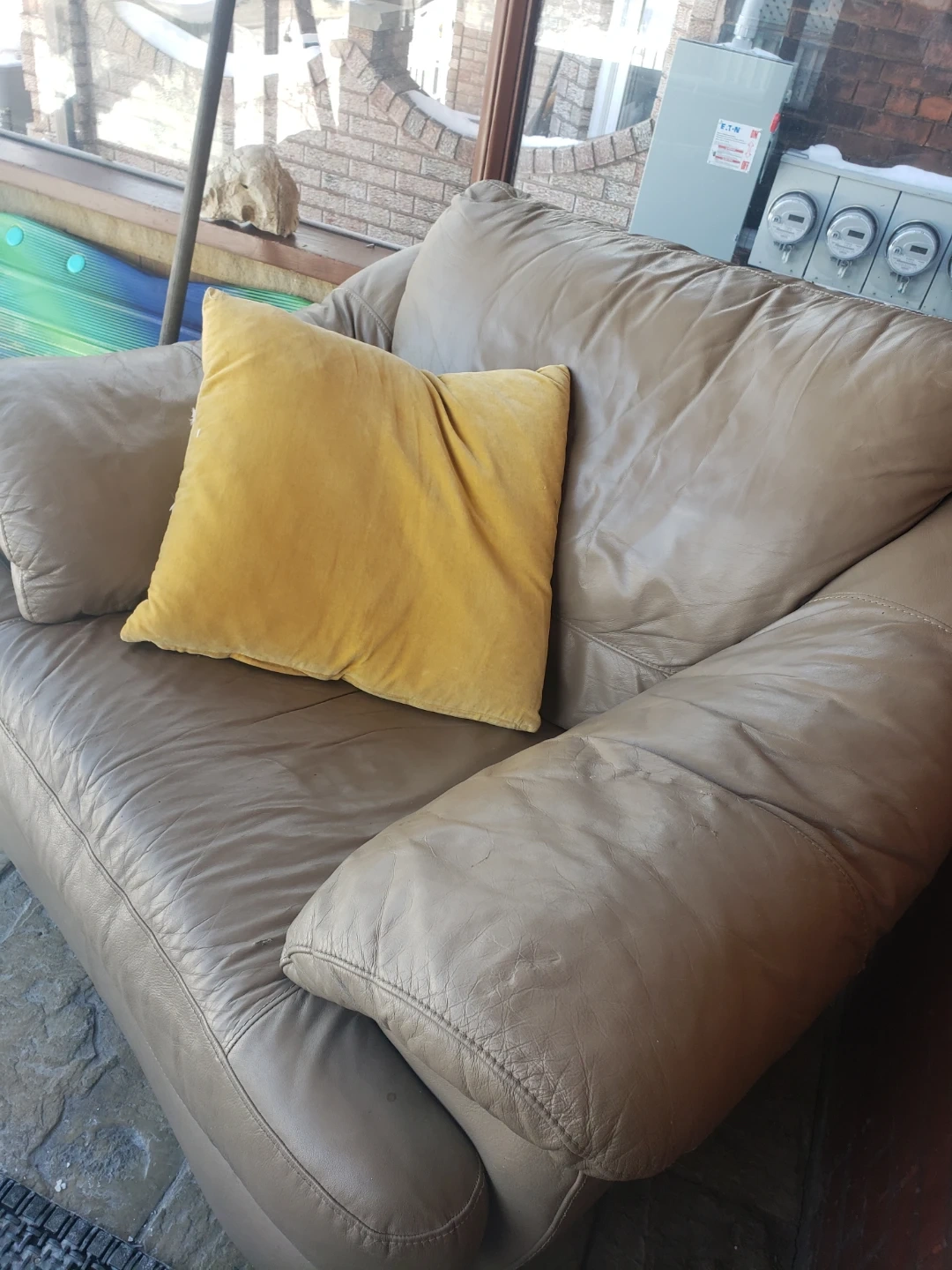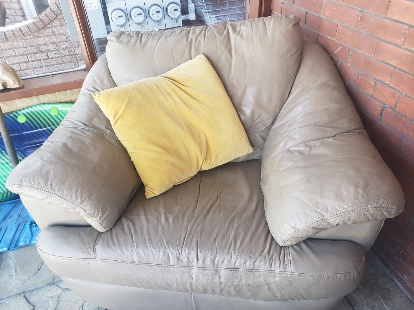 Taupe Leather Armchair with Yellow Pillow