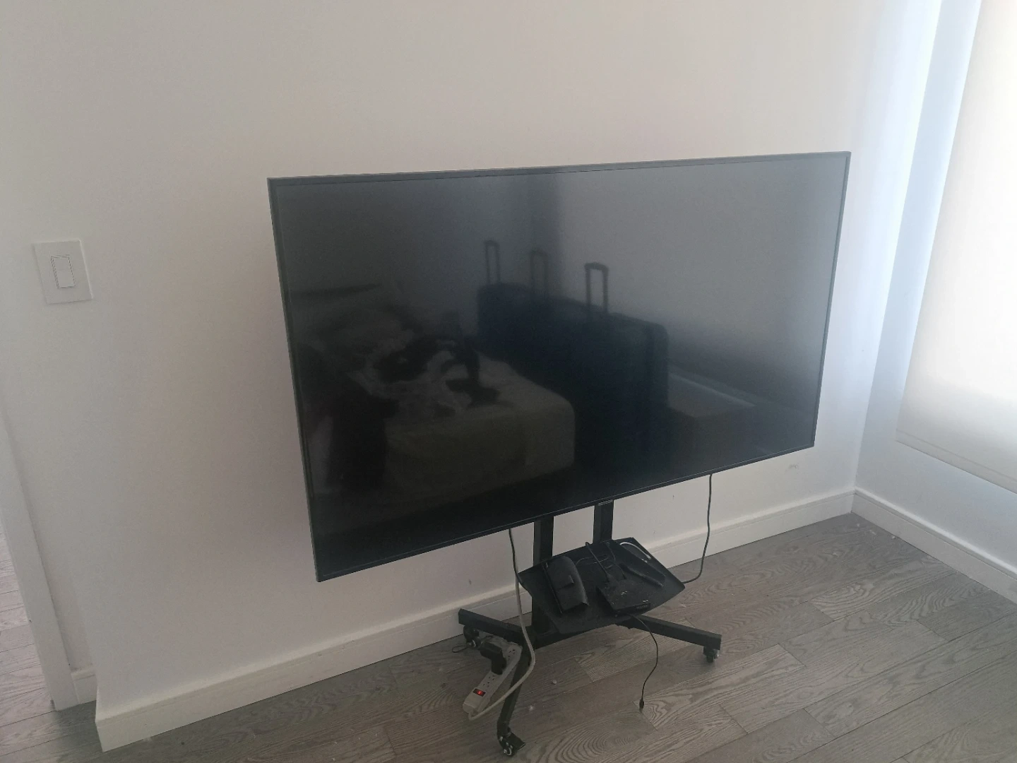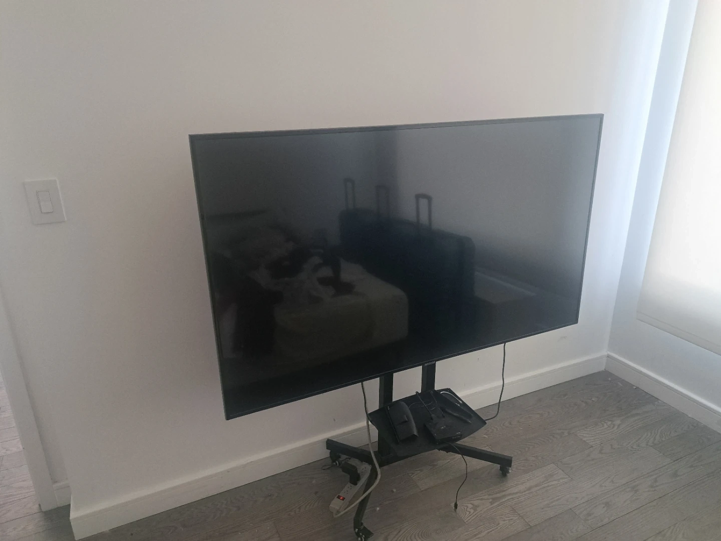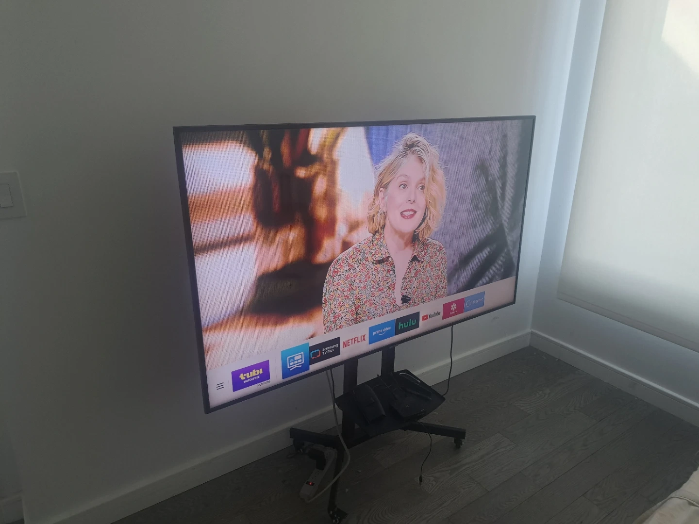 This is a 65-inch Samsung Smart TV. It comes with a rolling stand for easy placement. The TV is black and features a sleek design. It's perfect for any living room or entertainment space!