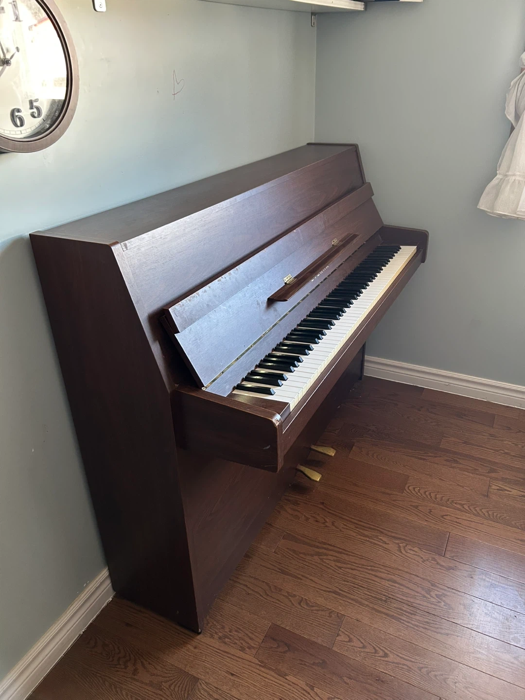A beautiful brown upright piano. It has 88 keys and three pedals. This piano's rich wood finish would complement any room. Plz keep in mind 1 key is broken (making wrong sound)