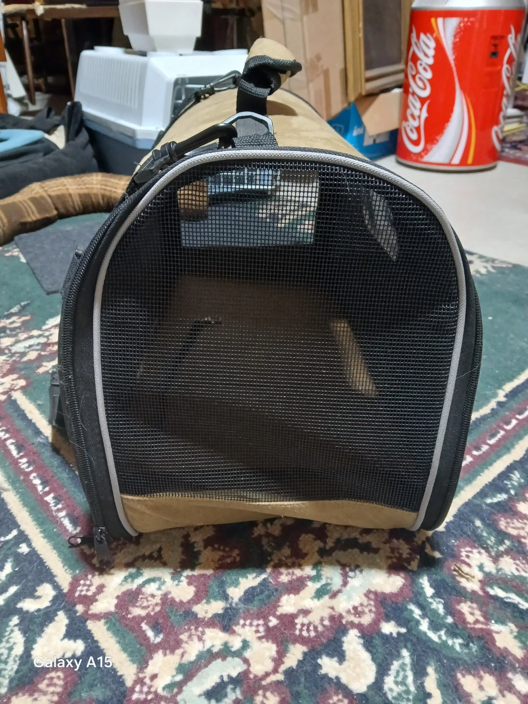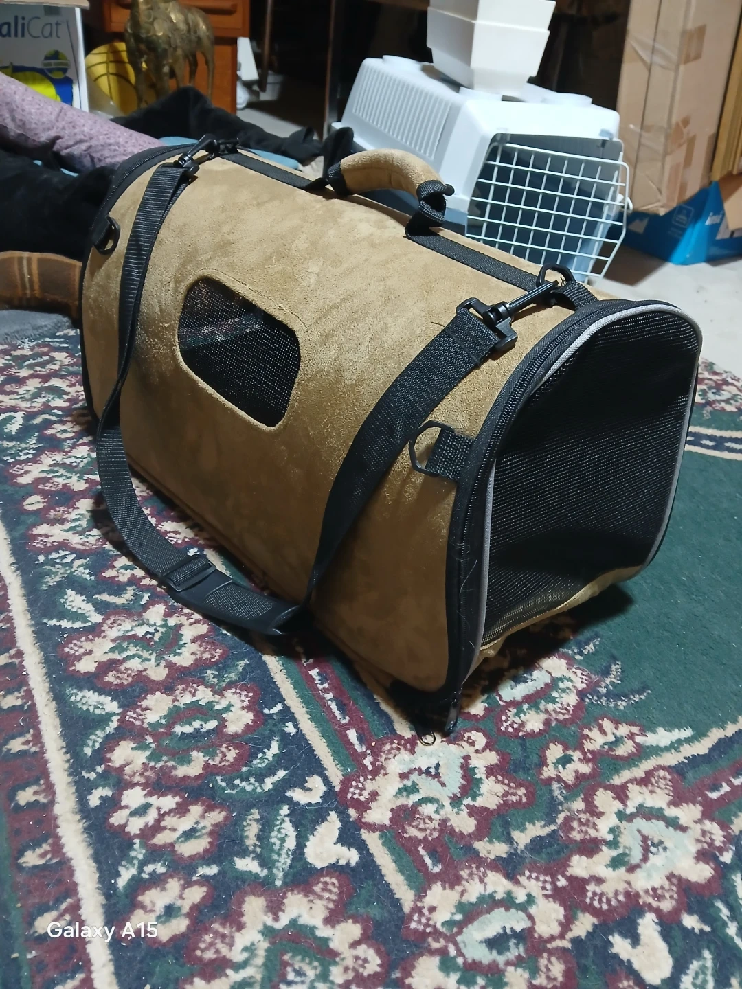 This soft-sided pet carrier is made from a tan suede-like material with black trim and mesh ventilation panels. It features a top handle and an adjustable shoulder strap for easy carrying. The carrier has a side opening for your pet. It's great for small dogs or cats!