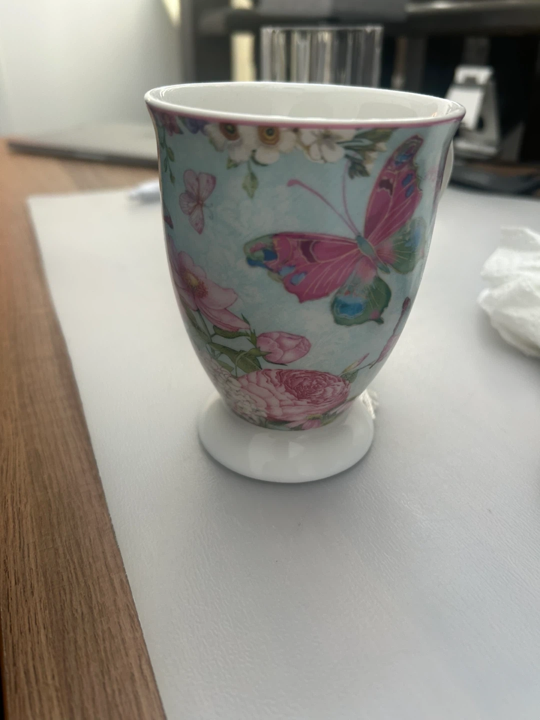Pretty ceramic teacup featuring a light blue background with pink butterflies and roses. It has a pedestal base, adding a touch of elegance. Perfect for drinking or displaying on your desk!