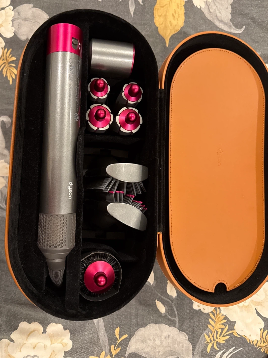 Dyson Airwrap Complete Styler in grey and fuchsia. Includes multiple brush attachments and barrels for curling, smoothing, and volumizing. Comes with its original storage case.