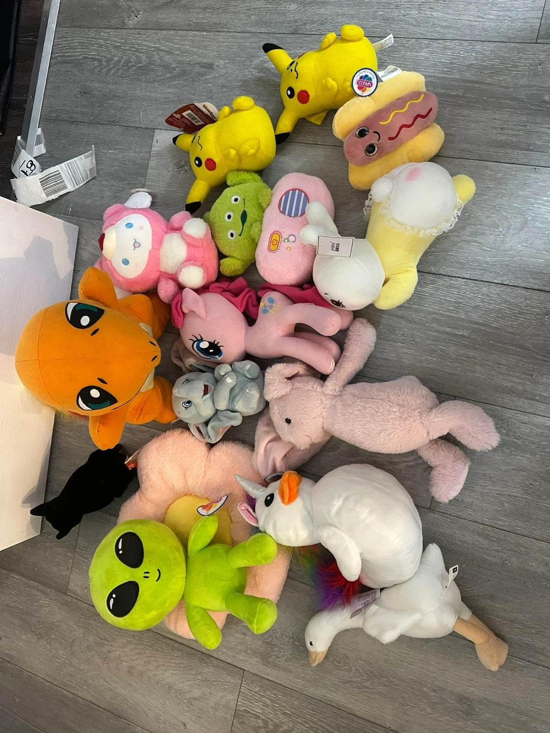 Bundle of various plush toys including Pikachu, a hot dog, alien, unicorn, and more! These stuffed friends are ready for a new home. They're soft and cuddly, perfect for playtime or decoration.