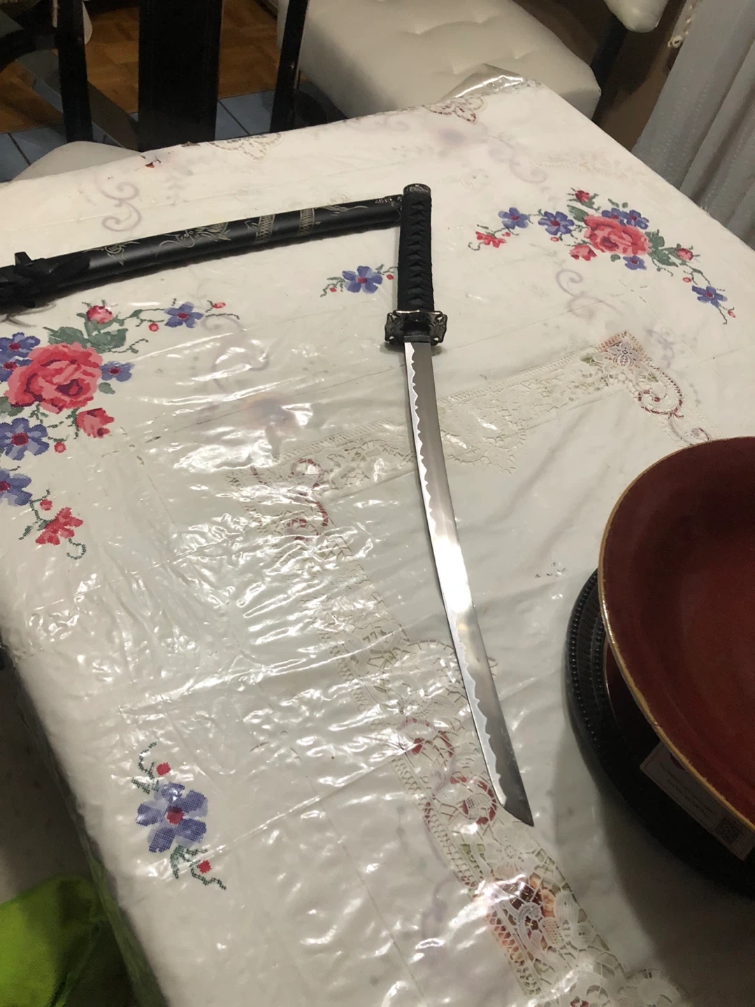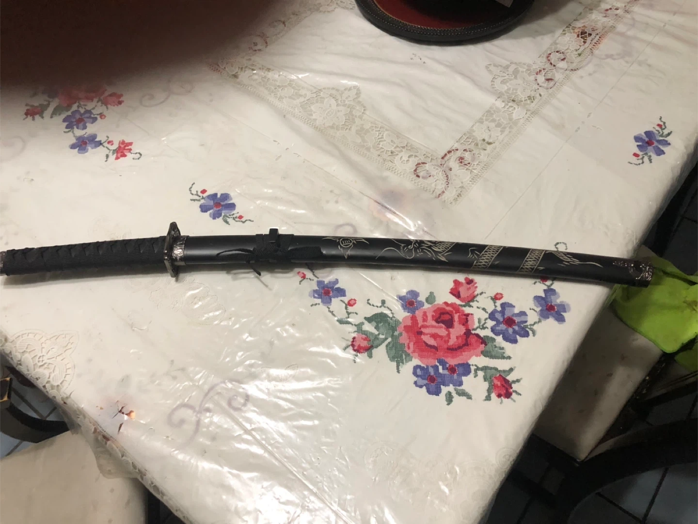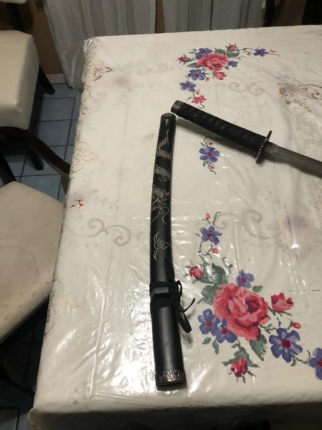 This is a decorative katana sword, complete with its scabbard. The scabbard has a black finish with an engraved dragon design. It's a unique display piece.
