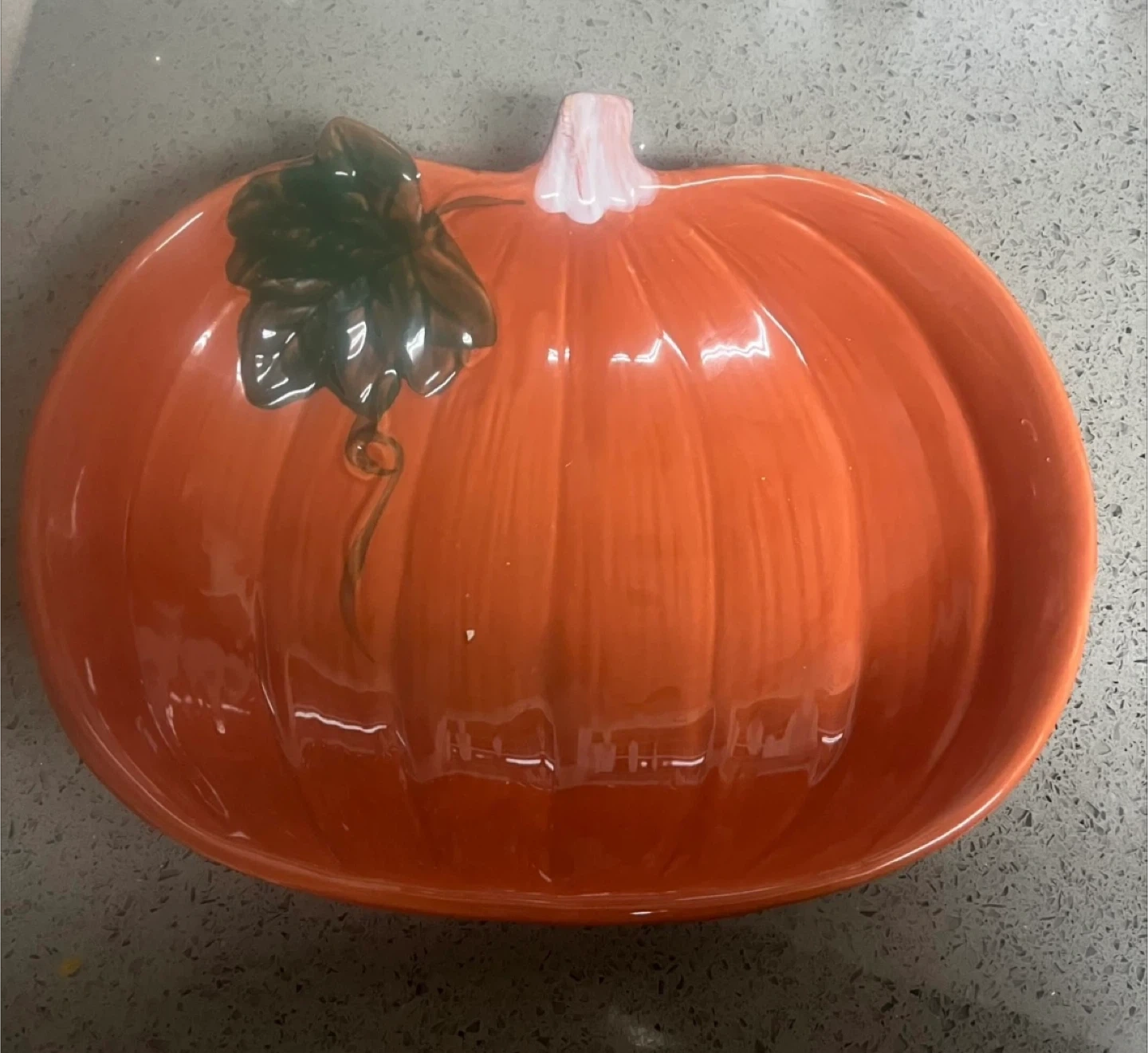 This ceramic serving bowl is shaped like a pumpkin, complete with a stem and leaf detail. It's perfect for fall gatherings and holiday meals! It's orange in colour and made of ceramic.