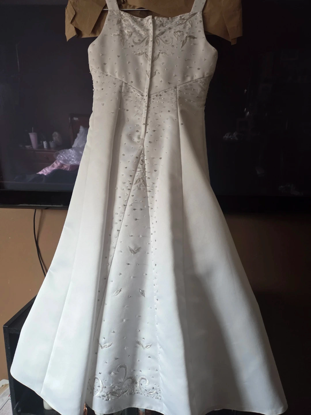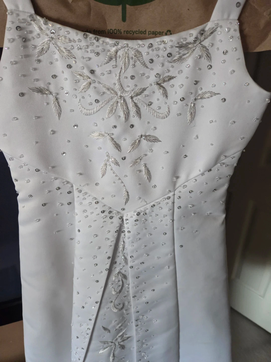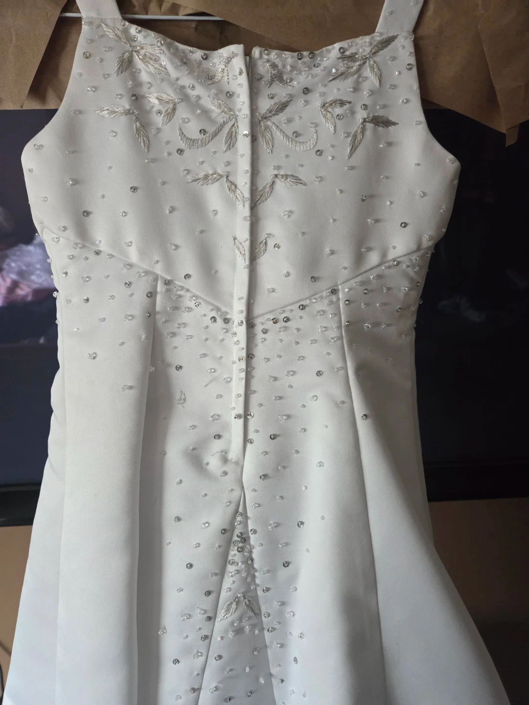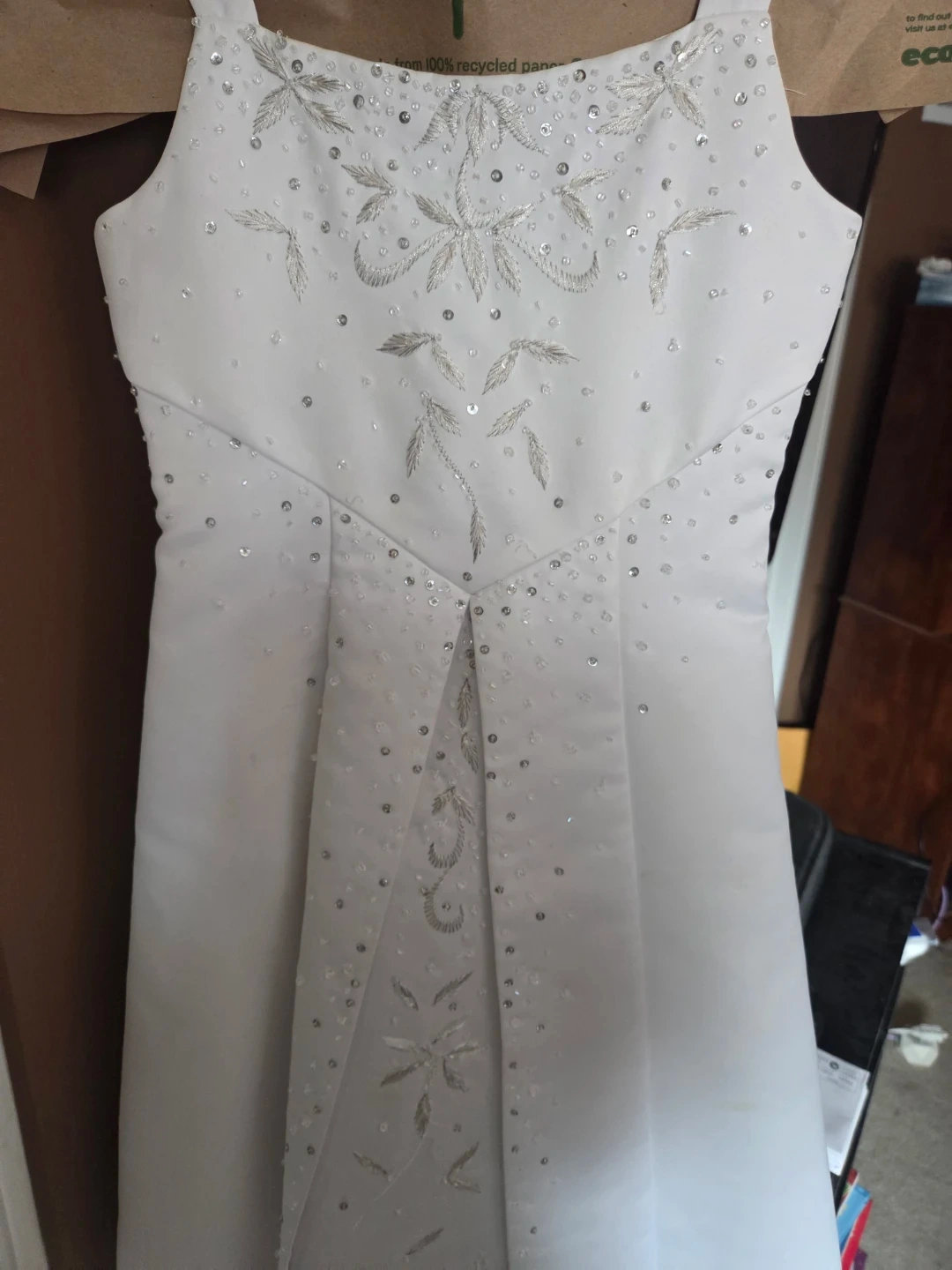 Beautiful white first communion or flower girl dresa- beadwork and embroidery on the bodice and skirt. sleeveless design and a zip closure at the back.