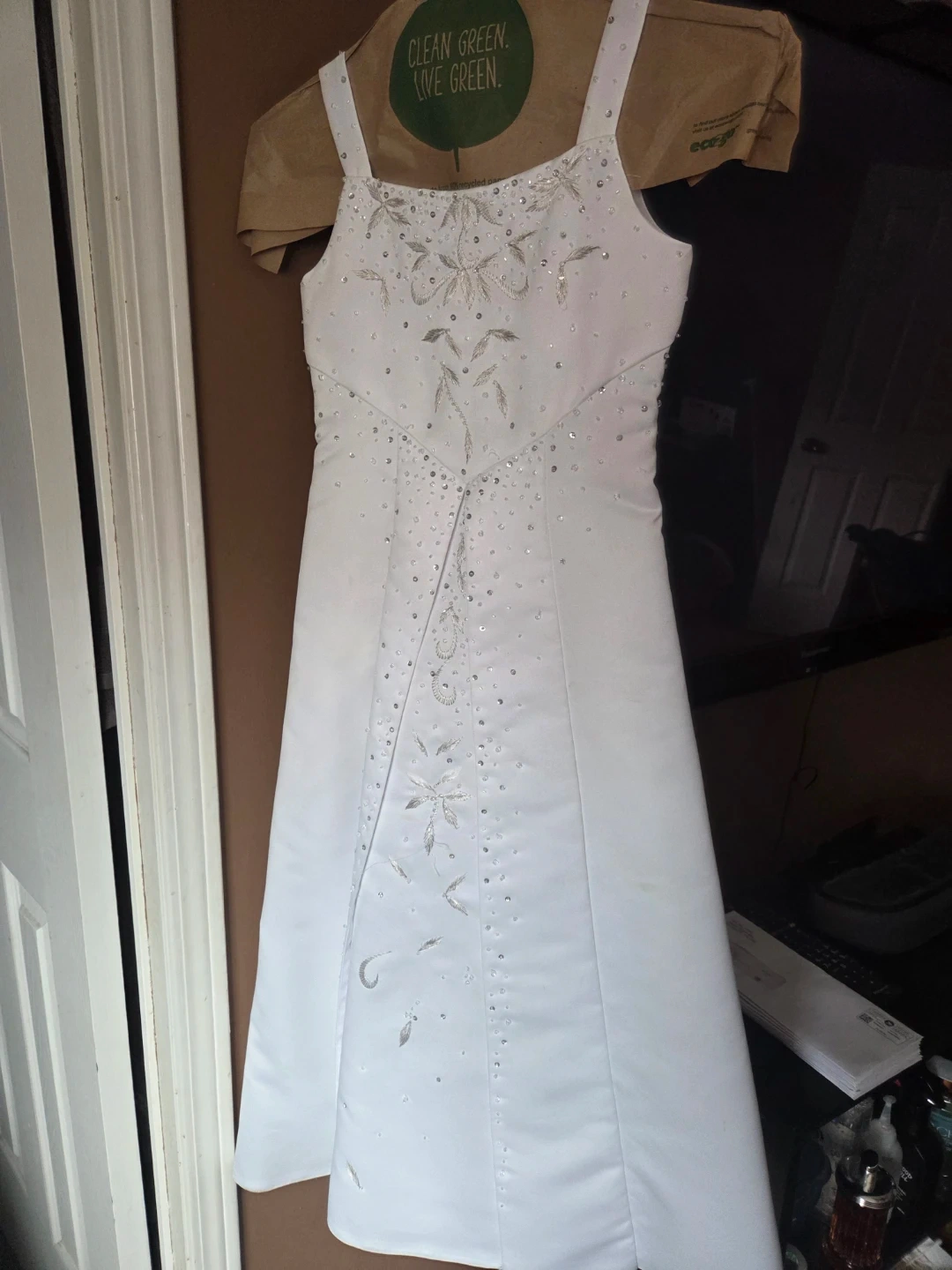 Beautiful white first communion or flower girl dresa- beadwork and embroidery on the bodice and skirt. sleeveless design and a zip closure at the back.