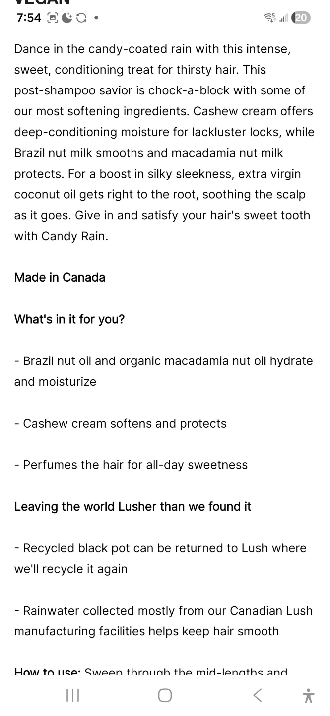 Lush Candy Rain conditioner is a sweet, conditioning treat for thirsty hair. It's made with Brazil nut oil, organic macadamia nut oil, and cashew cream. This post-shampoo conditioner offers deep-conditioning moisture for lackluster locks.