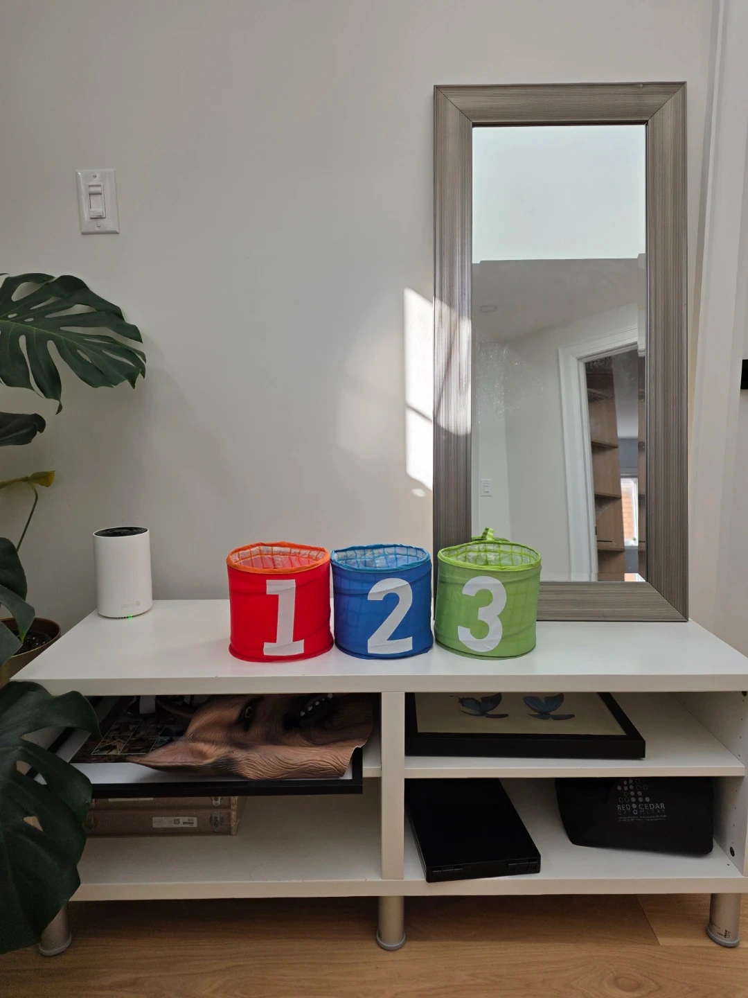 Three colourful fabric storage bins, numbered 1, 2, and 3. Perfect for organizing toys or small items. They're collapsible and easy to store when not in use.