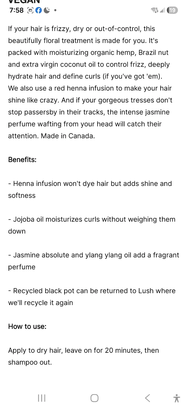 This hair treatment is made for frizzy, dry, or out-of-control hair. It's packed with moisturizing organic hemp, Brazil nut and extra virgin coconut oil to control frizz and deeply hydrate hair. It also uses a red henna infusion to make hair shine and jasmine perfume to make your hair catch attention. Made in Canada.