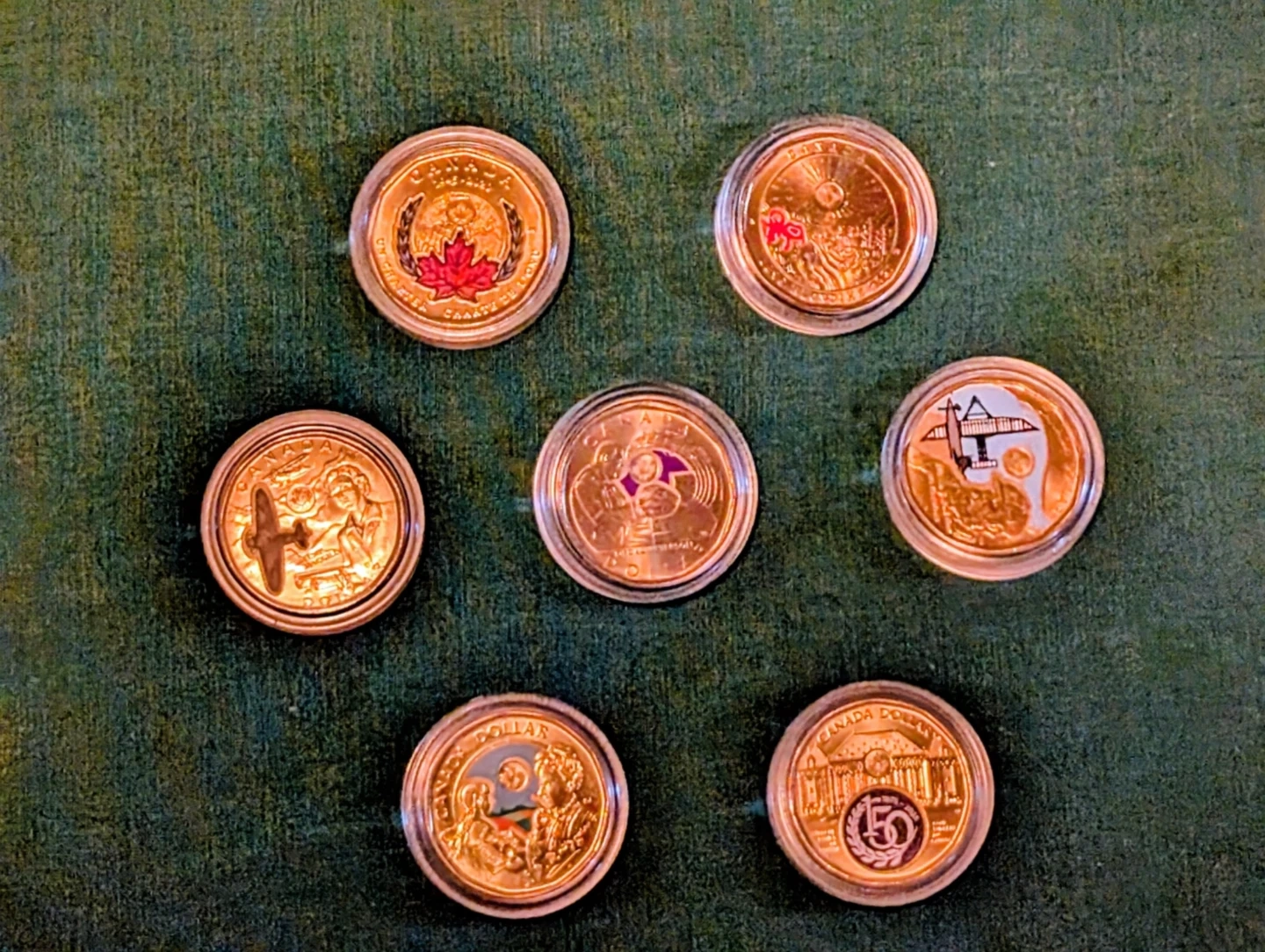 Collection of all the Canadian commemorative dollar coins issued by the Canadian mint to date. Each featuring unique designs celebrating different aspects of Canadian history and culture.