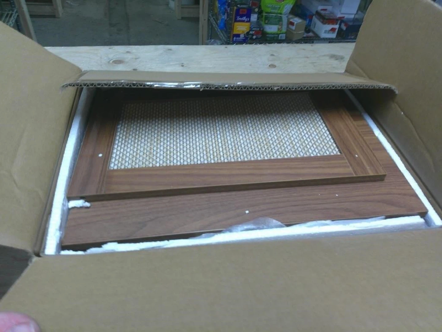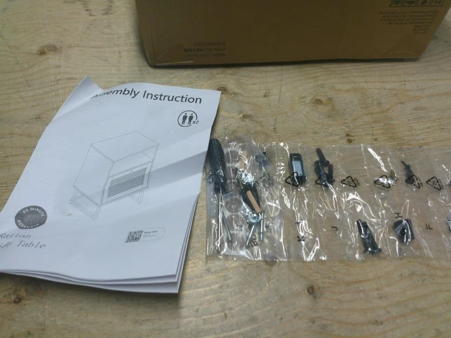A Rattan Side Table is ready for assembly. It features a wood grain finish with a woven rattan insert. This table includes all necessary hardware for setup. Perfect for adding a touch of style to any room!