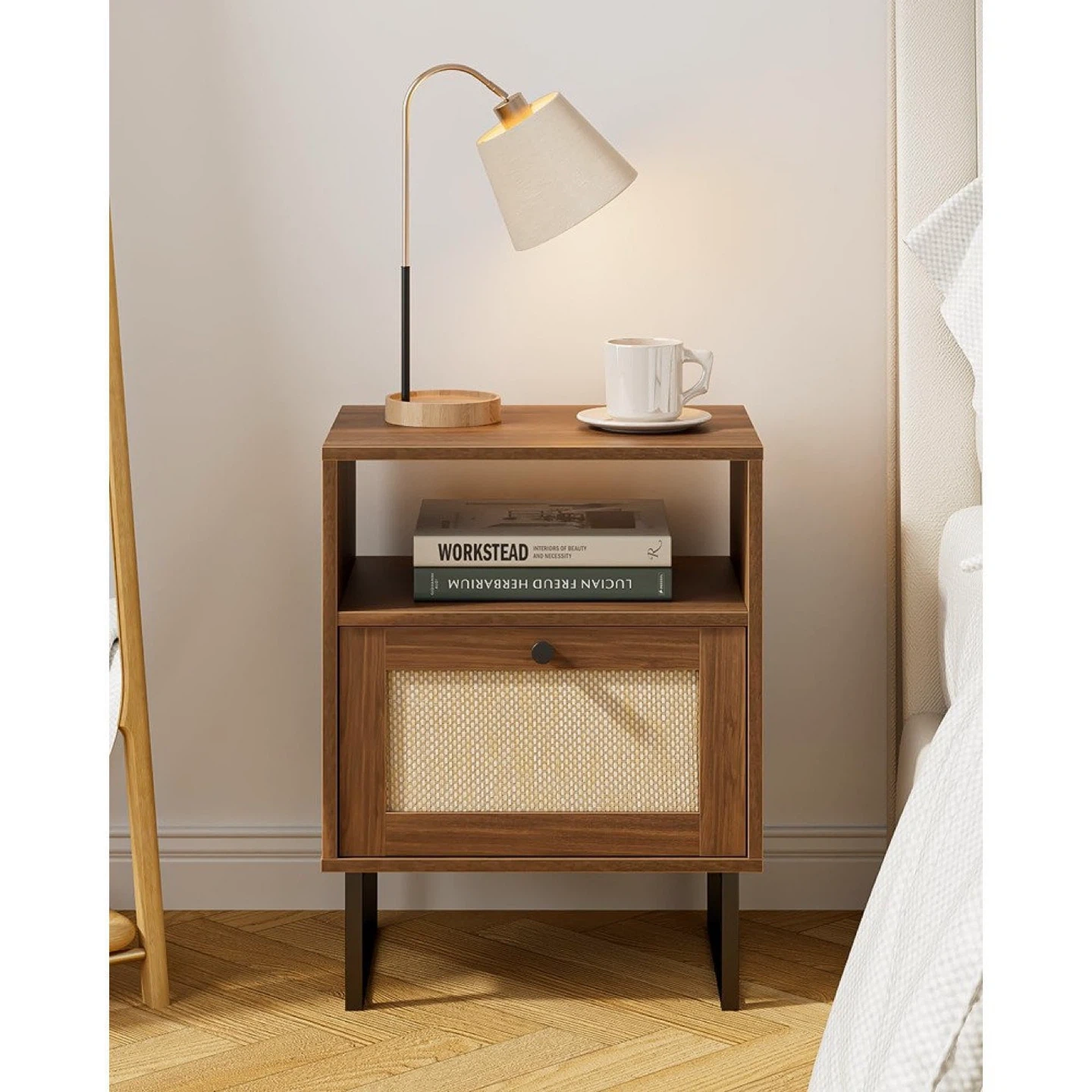 A Rattan Side Table is ready for assembly. It features a wood grain finish with a woven rattan insert. This table includes all necessary hardware for setup. Perfect for adding a touch of style to any room!