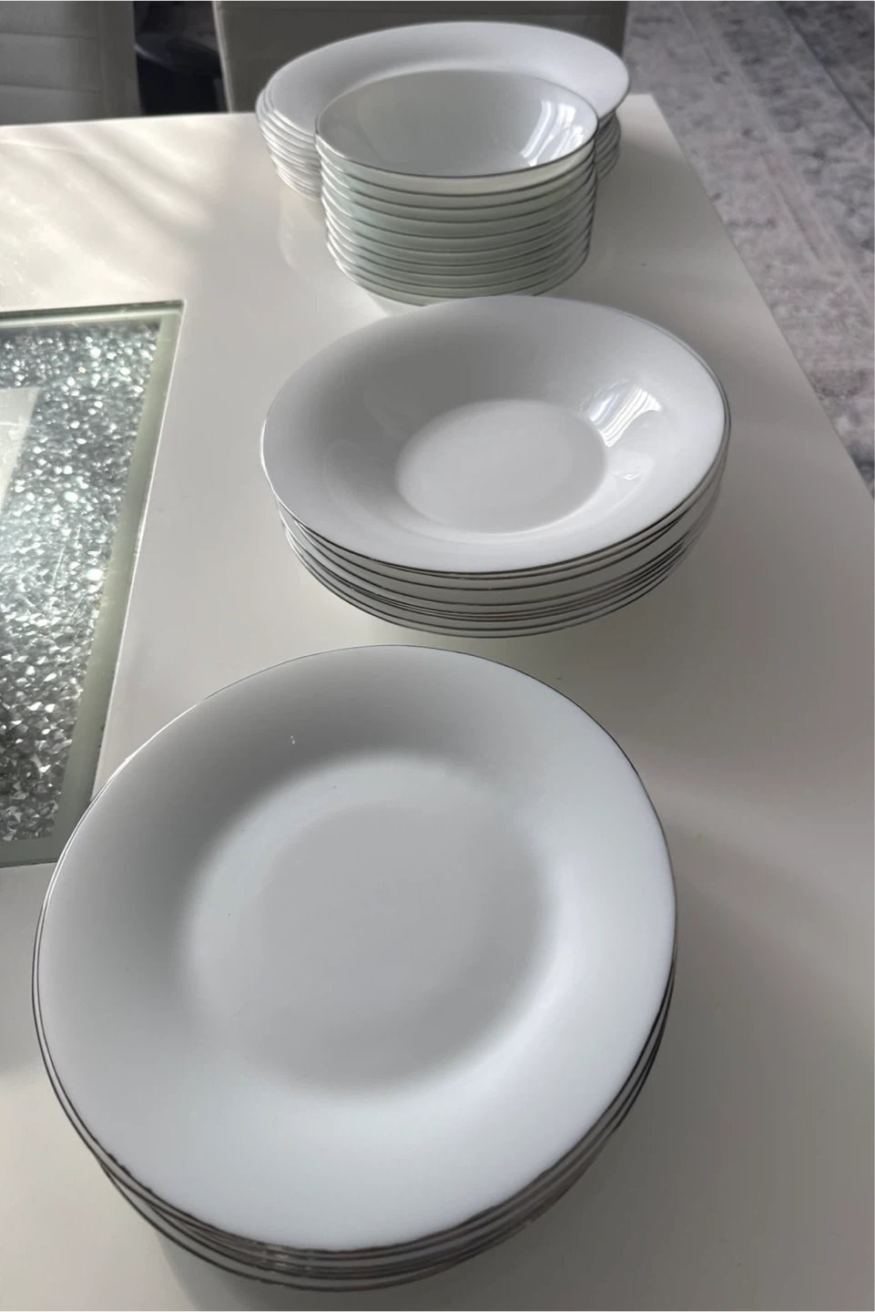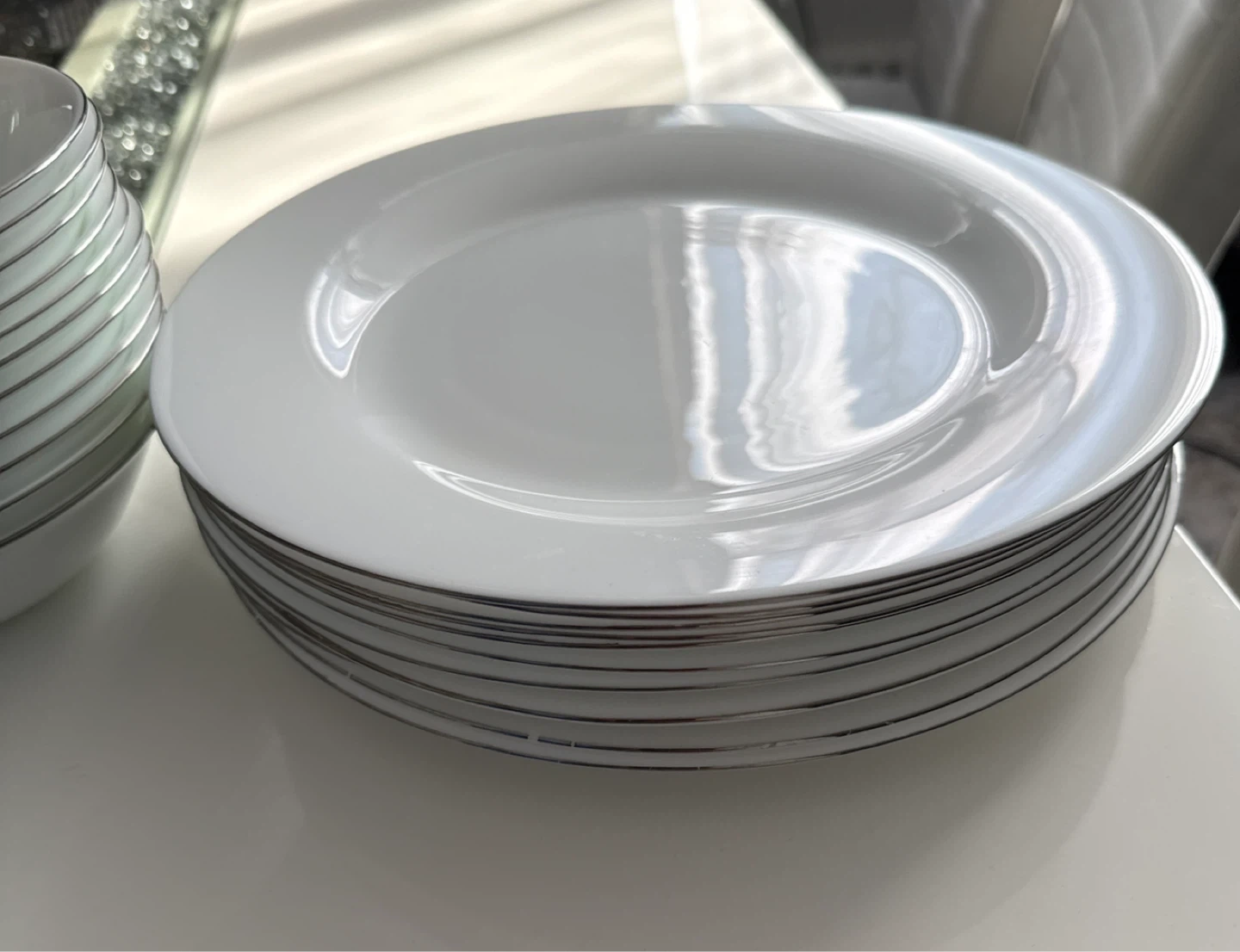 Set of white porcelain plates and bowls with a thin silver rim. These are great for everyday use or for special occasions. Dishwasher and microwave safe.