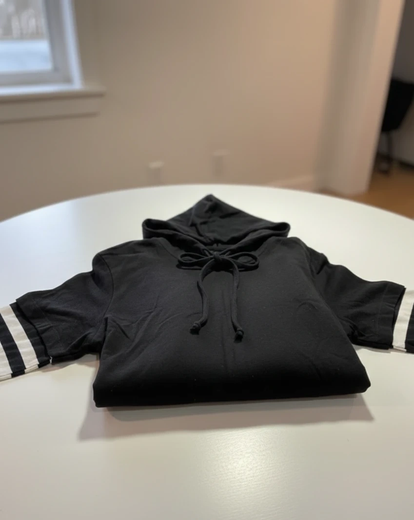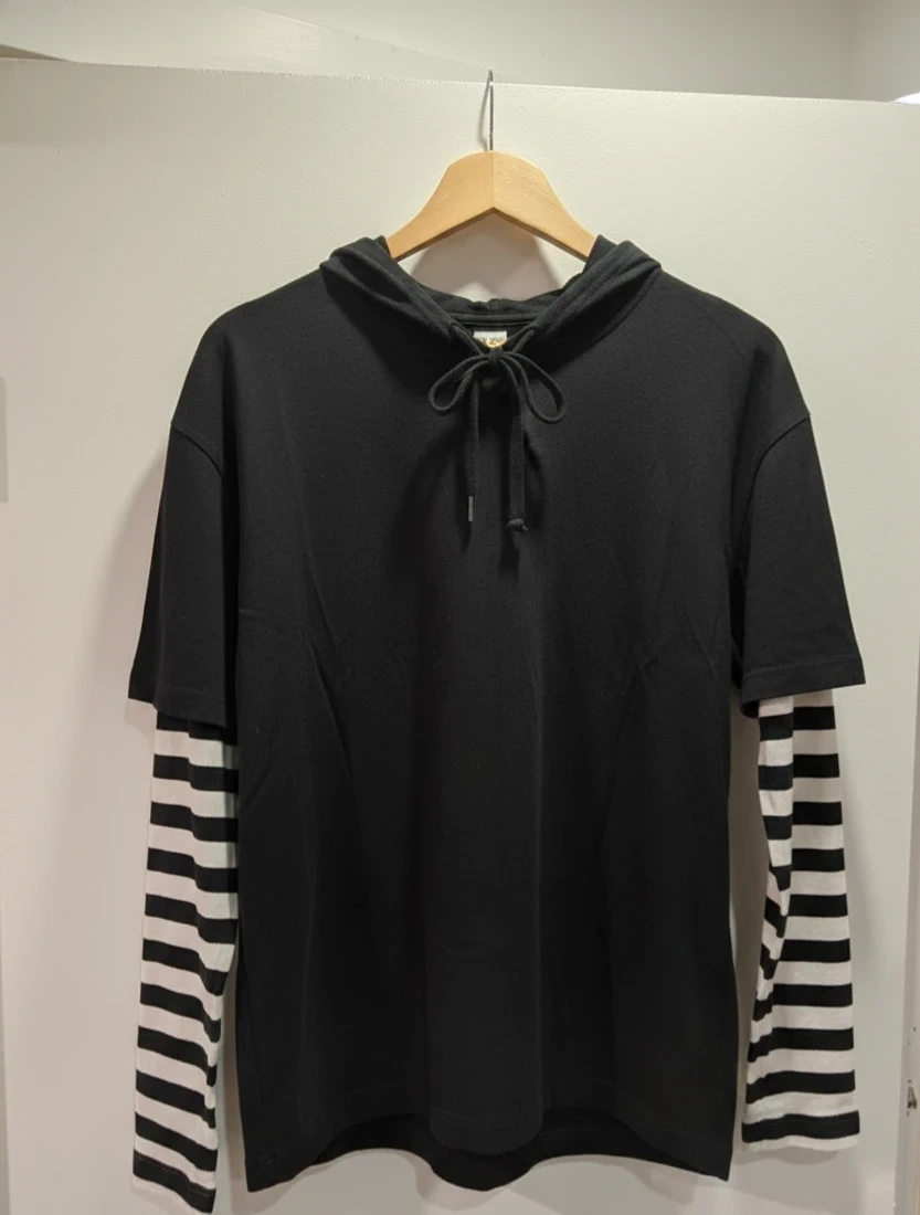 This is a black layered hoodie from Hot Topic. It's a size large with white striped long sleeves peeking out from under the short sleeves. The hoodie is made of 60% cotton and 40% polyester, exclusive of trims. It features a drawstring hood and a black body.