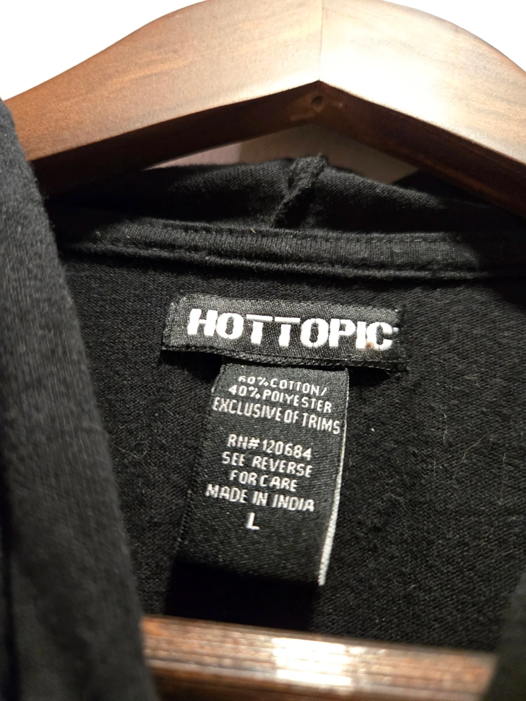 This is a black layered hoodie from Hot Topic. It's a size large with white striped long sleeves peeking out from under the short sleeves. The hoodie is made of 60% cotton and 40% polyester, exclusive of trims. It features a drawstring hood and a black body.