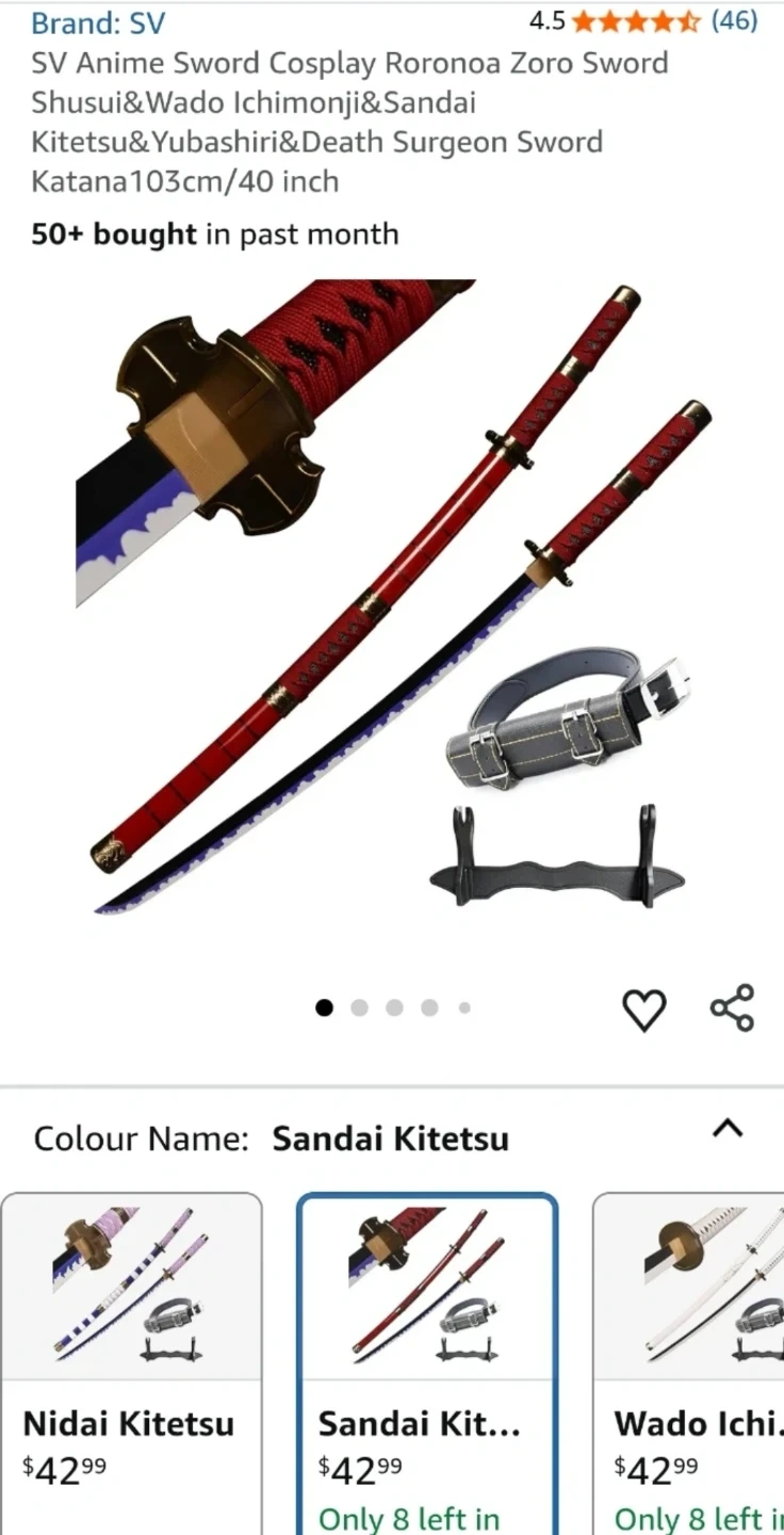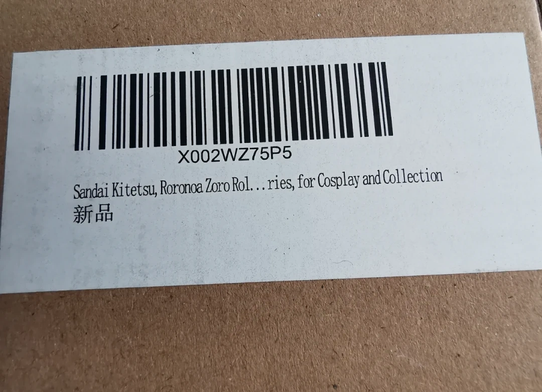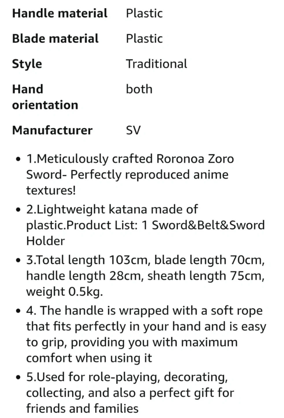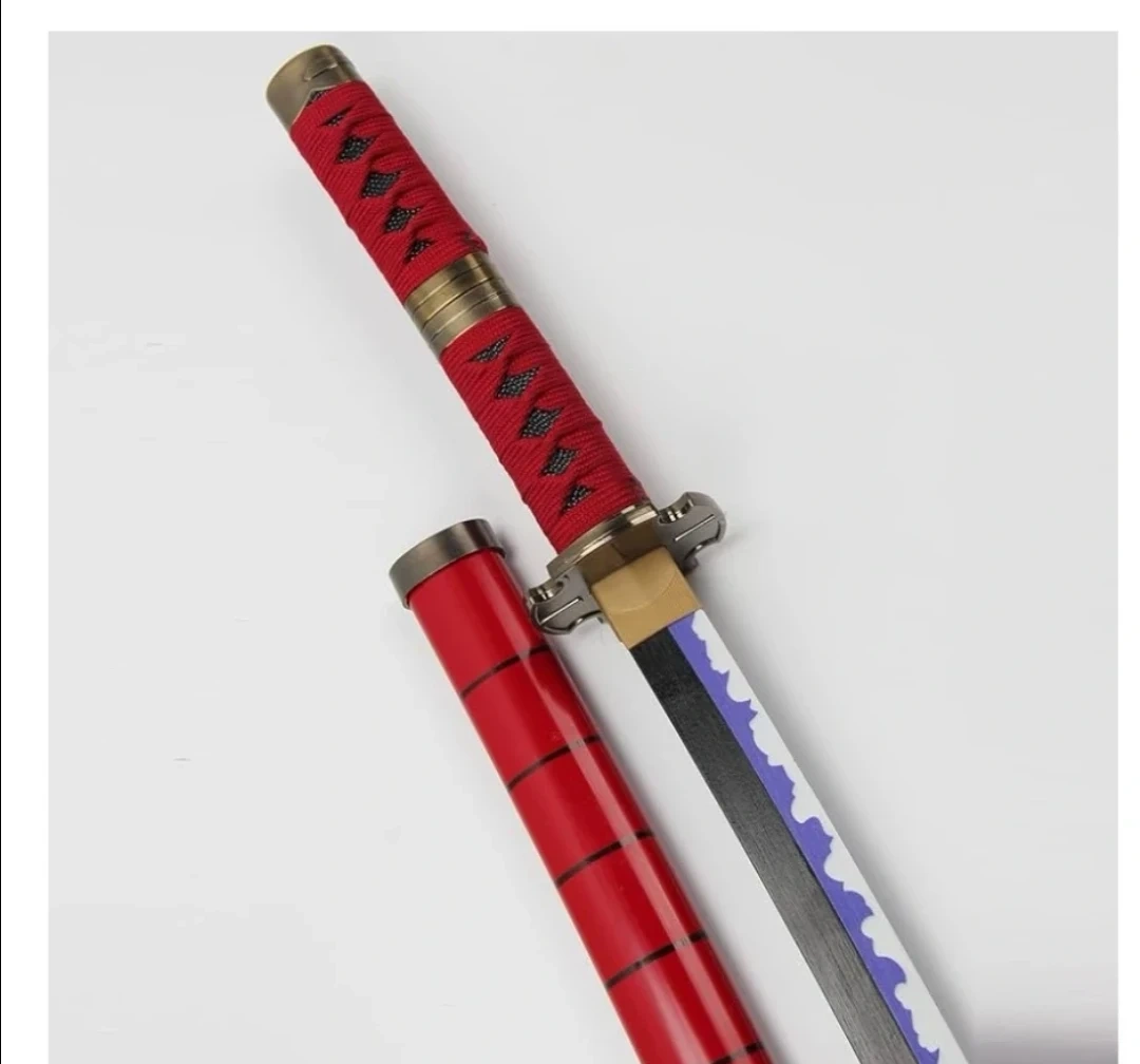 Lightweight Roronoa Zoro cosplay katana made of plastic. Total length 103cm, blade length 70cm, handle length 28cm, sheath length 75cm. The handle's soft rope wrap provides a comfy grip. Includes sword, belt, and sword holder.