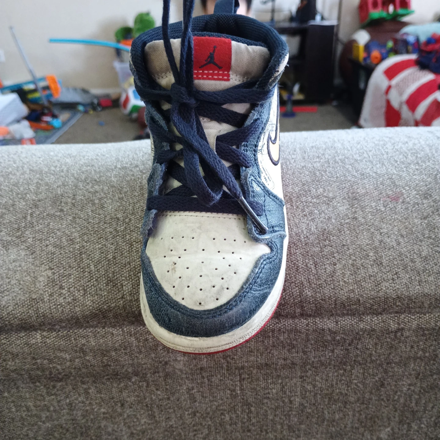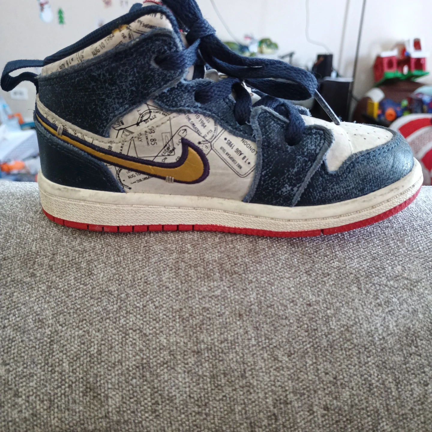 Toddler-sized Air Jordan 1 Mid SE sneakers with a passport stamp graphic. These shoes feature a mix of white, navy, and gold accents. They're designed with a mid-top silhouette and lace-up closure.