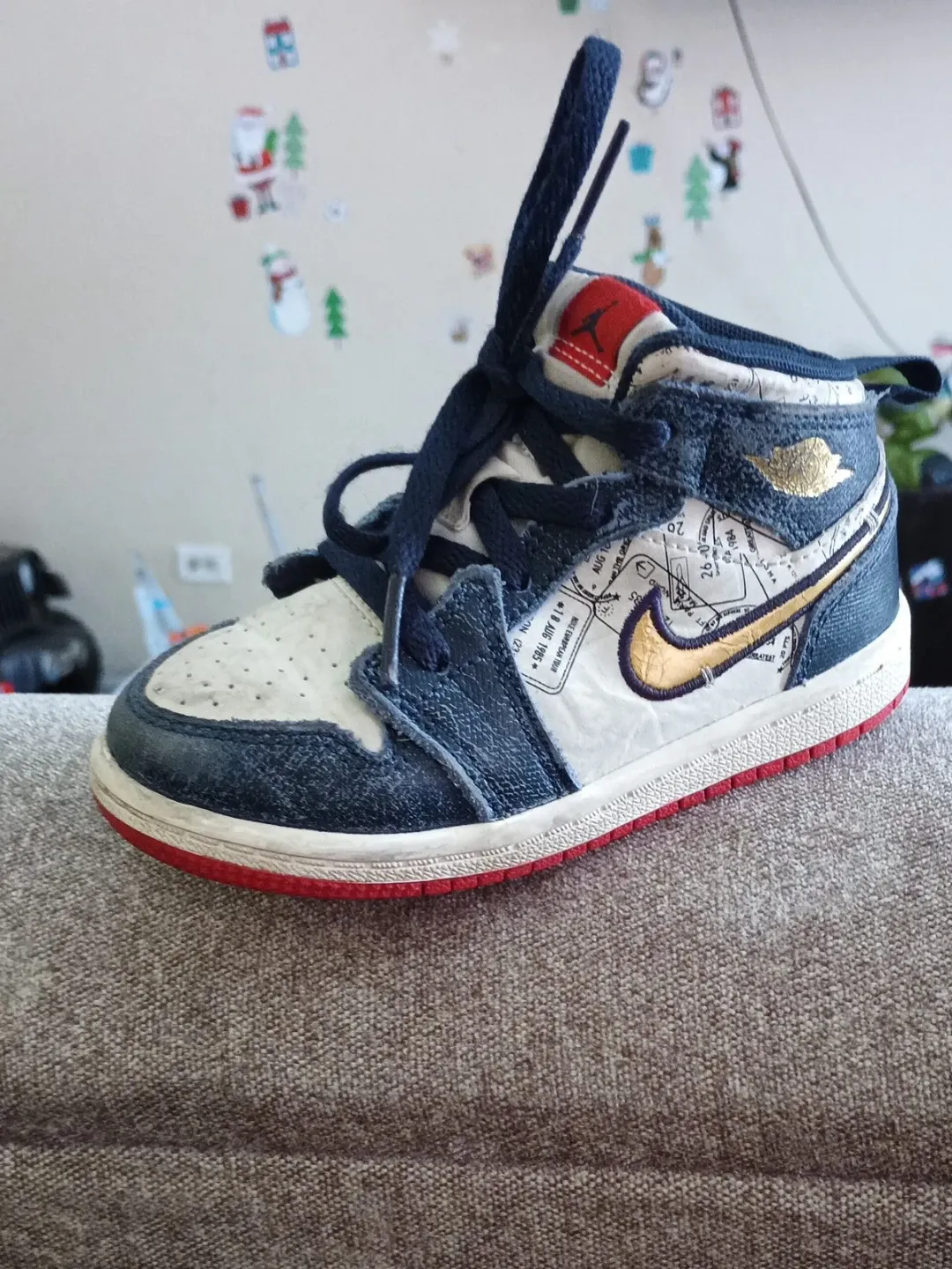 Toddler-sized Air Jordan 1 Mid SE sneakers with a passport stamp graphic. These shoes feature a mix of white, navy, and gold accents. They're designed with a mid-top silhouette and lace-up closure.