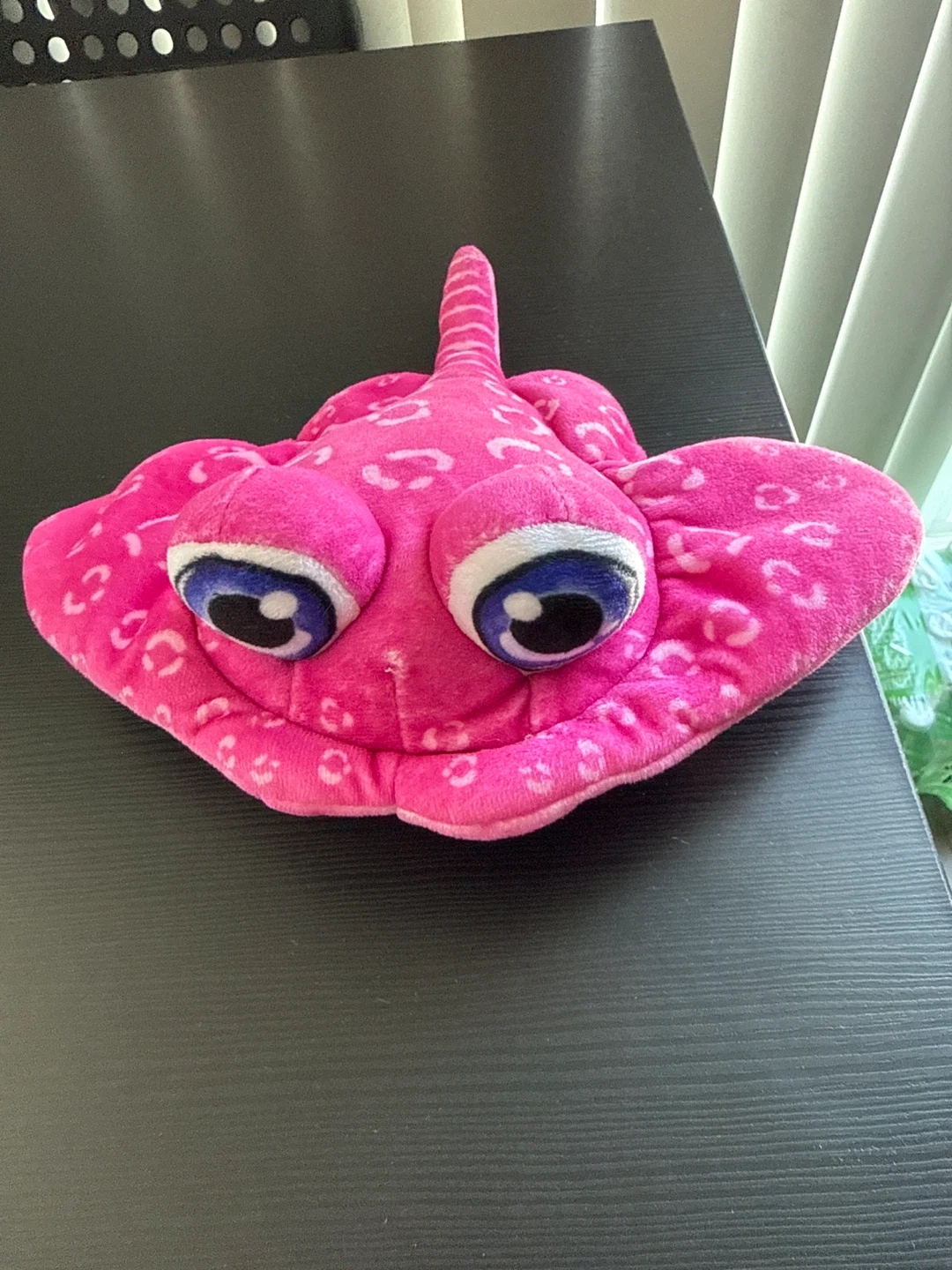 This is a soft pink plush toy shaped like a stingray. It has a pattern of lighter pink spots all over its body and wings. Its big eyes are blue with black pupils and white highlights. This toy is super cuddly and would make a fun companion!