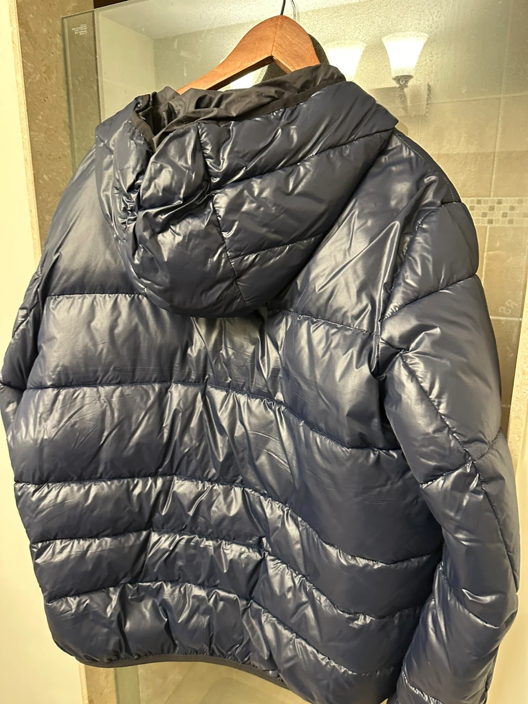 This DKNY puffer jacket comes in a shiny navy blue colour. It features a hood and a full zip-up front. The jacket is size XL.