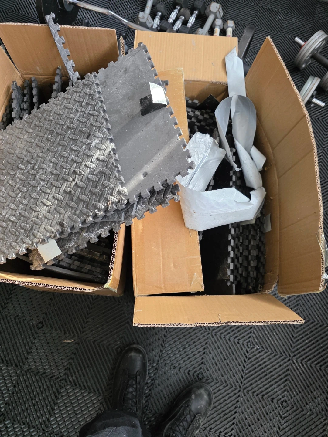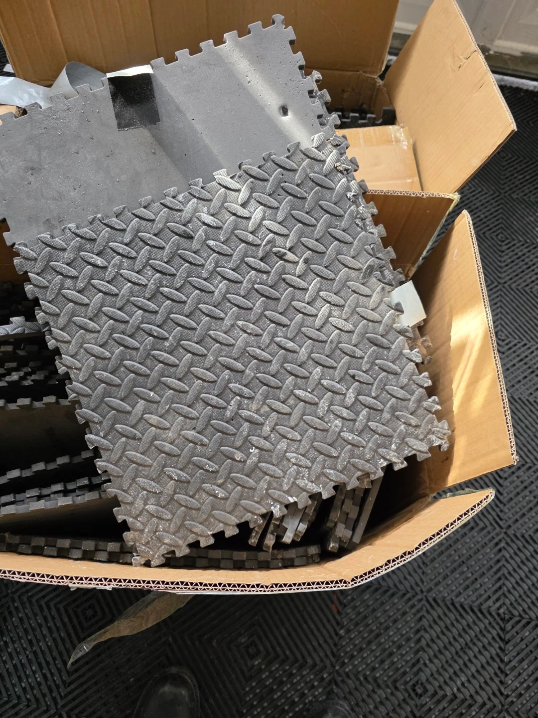 Set of interlocking foam floor tiles with a diamond plate pattern. These mats are great for gyms, workshops, or play areas. They're easy to assemble and provide cushioning.