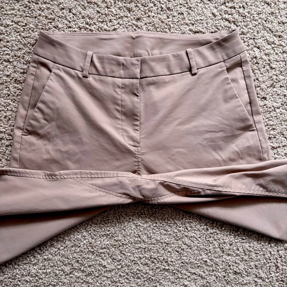 Mid-rise, slim-fit pants made of eco-friendly, water-resistant, moisture-wicking Navigator fabric. An added gusset and extra stretch makes them comfortable all day. Dress these up or down for a trendy or street style look. These pants are in excellent pre-loved condition. Model photos are included to illustrate fit only (the pants are a bit darker than stock photos).