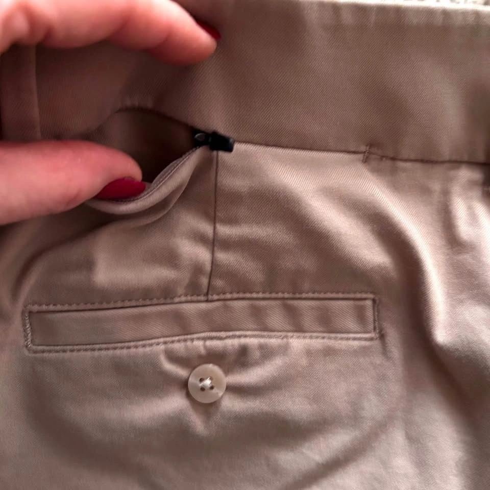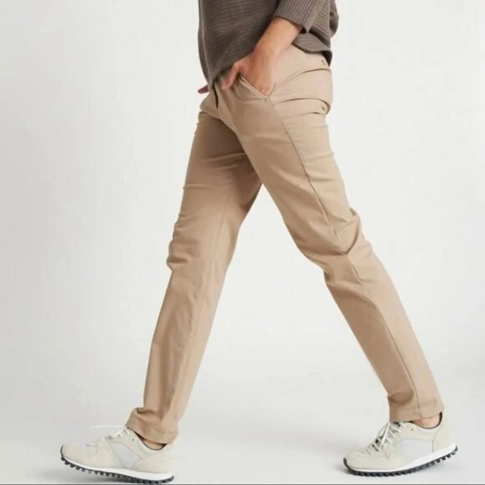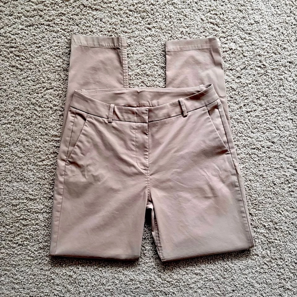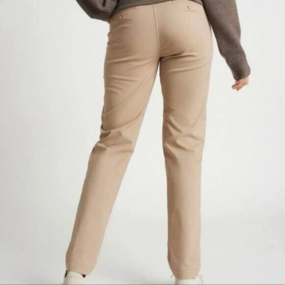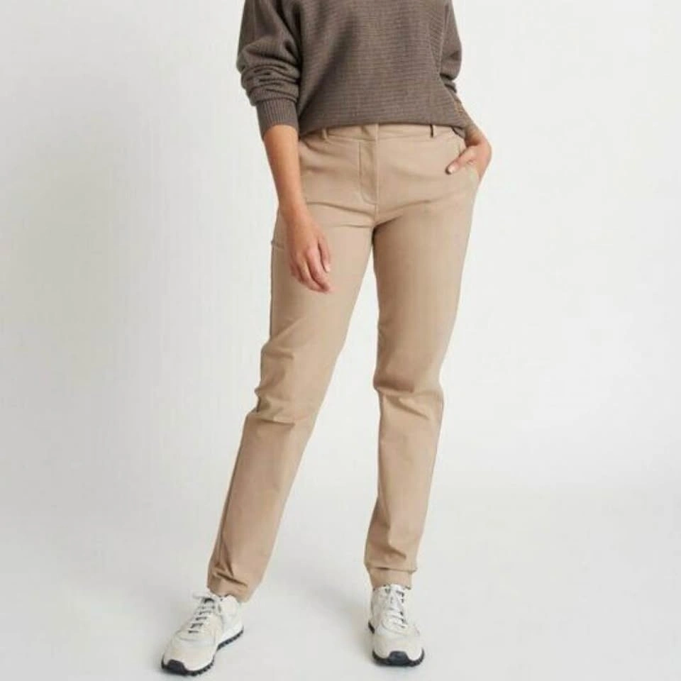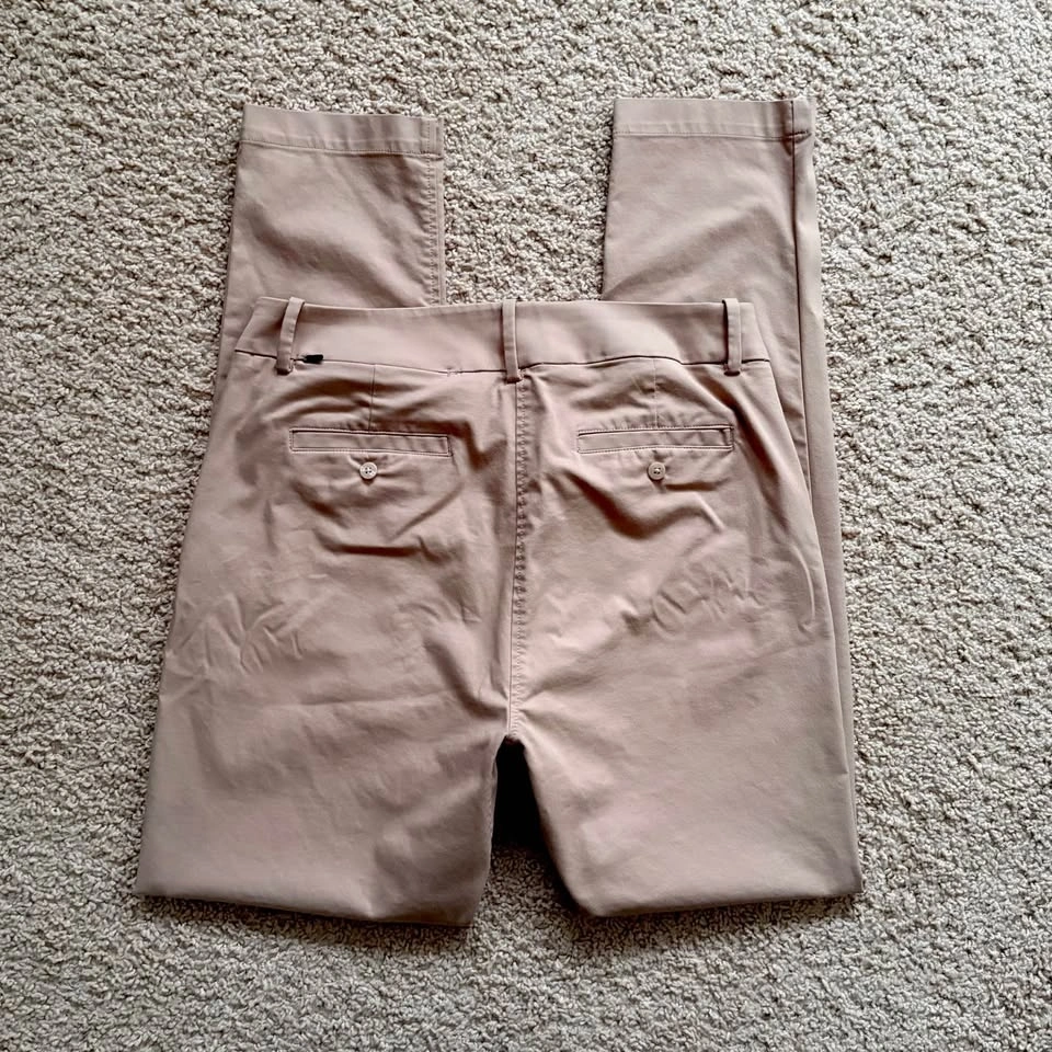Mid-rise, slim-fit pants made of eco-friendly, water-resistant, moisture-wicking Navigator fabric. An added gusset and extra stretch makes them comfortable all day. Dress these up or down for a trendy or street style look. These pants are in excellent pre-loved condition. Model photos are included to illustrate fit only (the pants are a bit darker than stock photos).