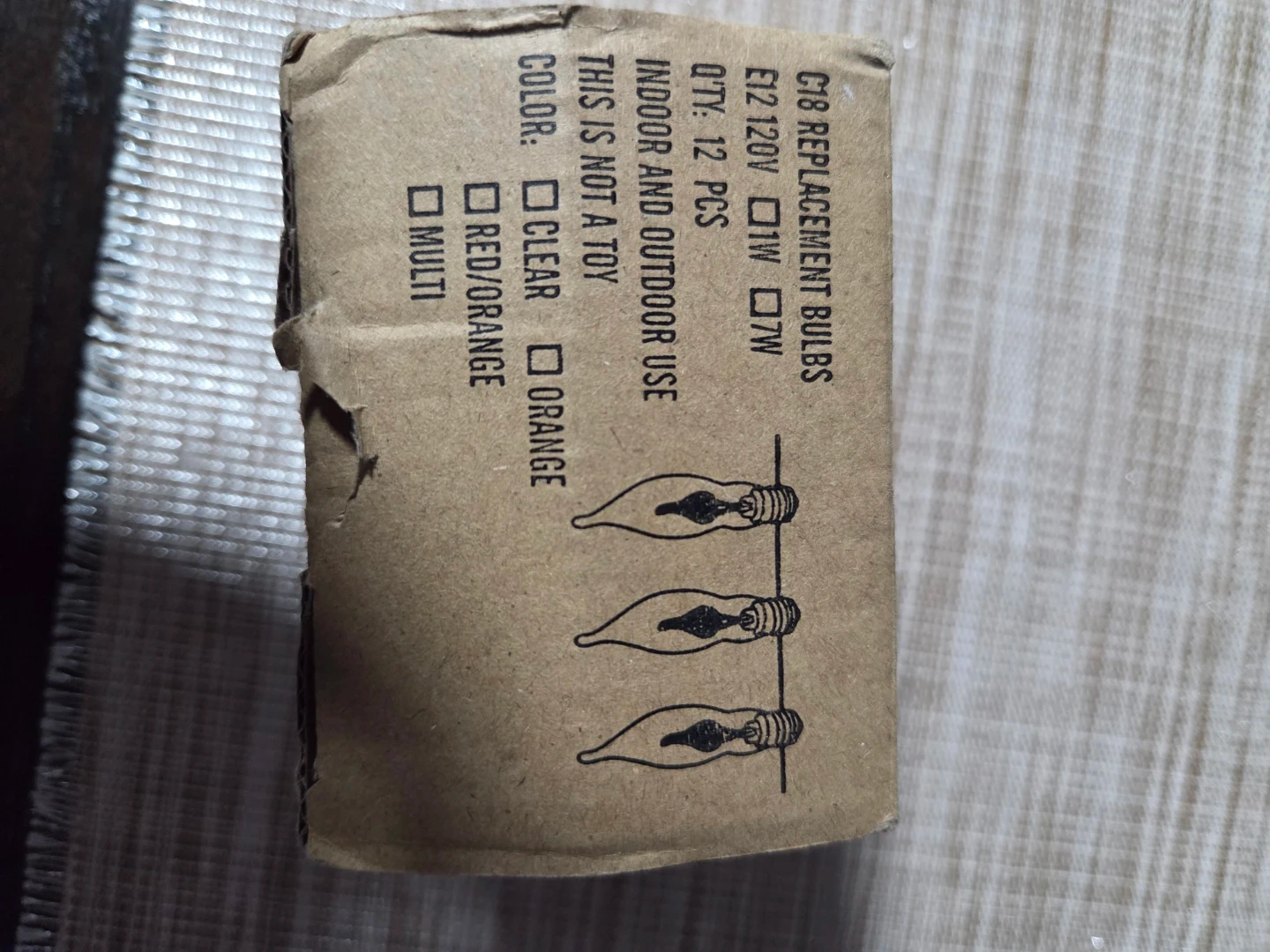 These are C18 replacement bulbs, designed for indoor and outdoor use. They're 120V, with 1W and 7W options. This pack includes 12 clear bulbs with a red/yellow flame tip design. They're great for holiday lighting projects!