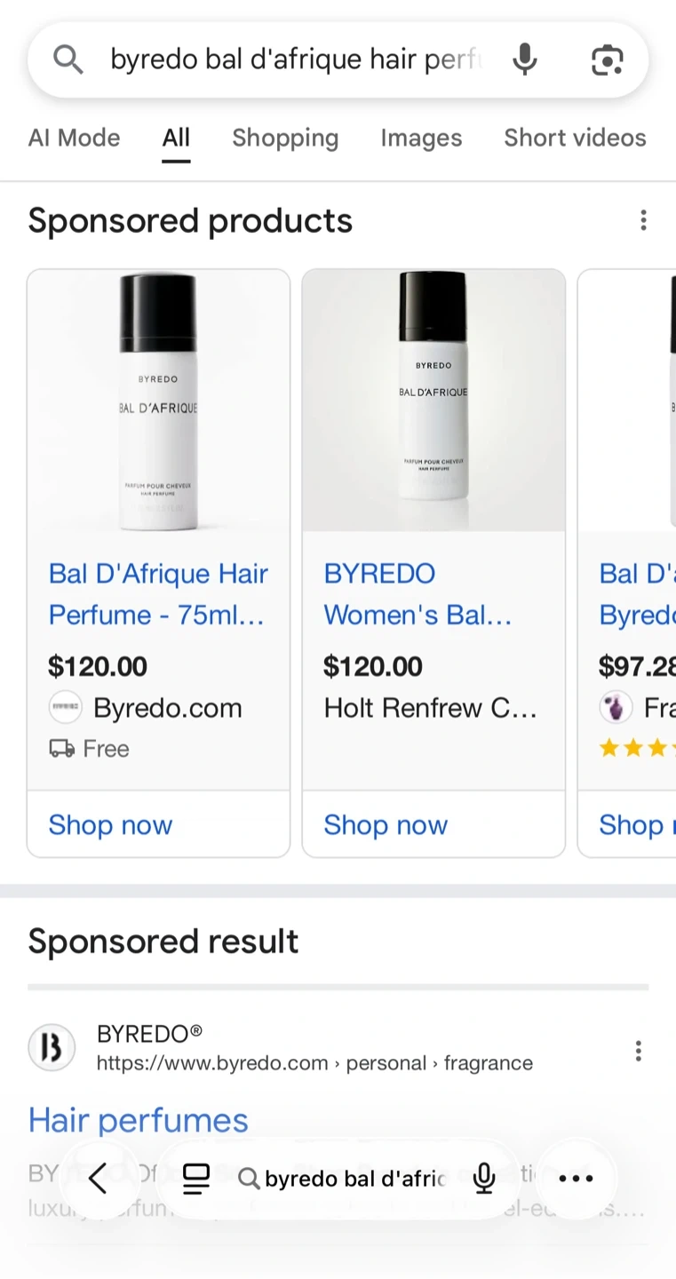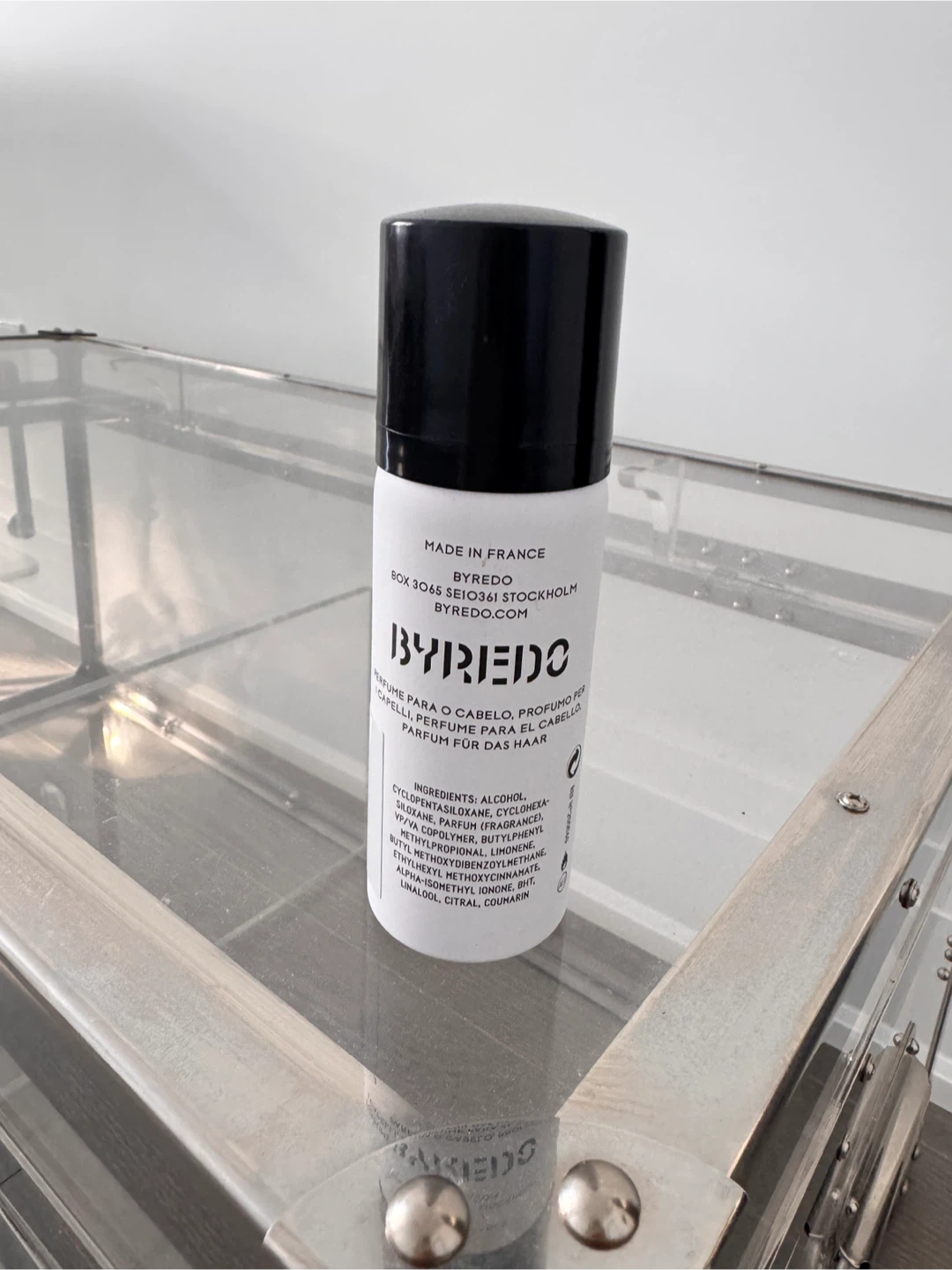 This is a 75ml bottle of Byredo Bal D'Afrique hair perfume. It's made in France and includes alcohol, cyclopentasiloxane, and fragrance. It's for perfuming your hair.