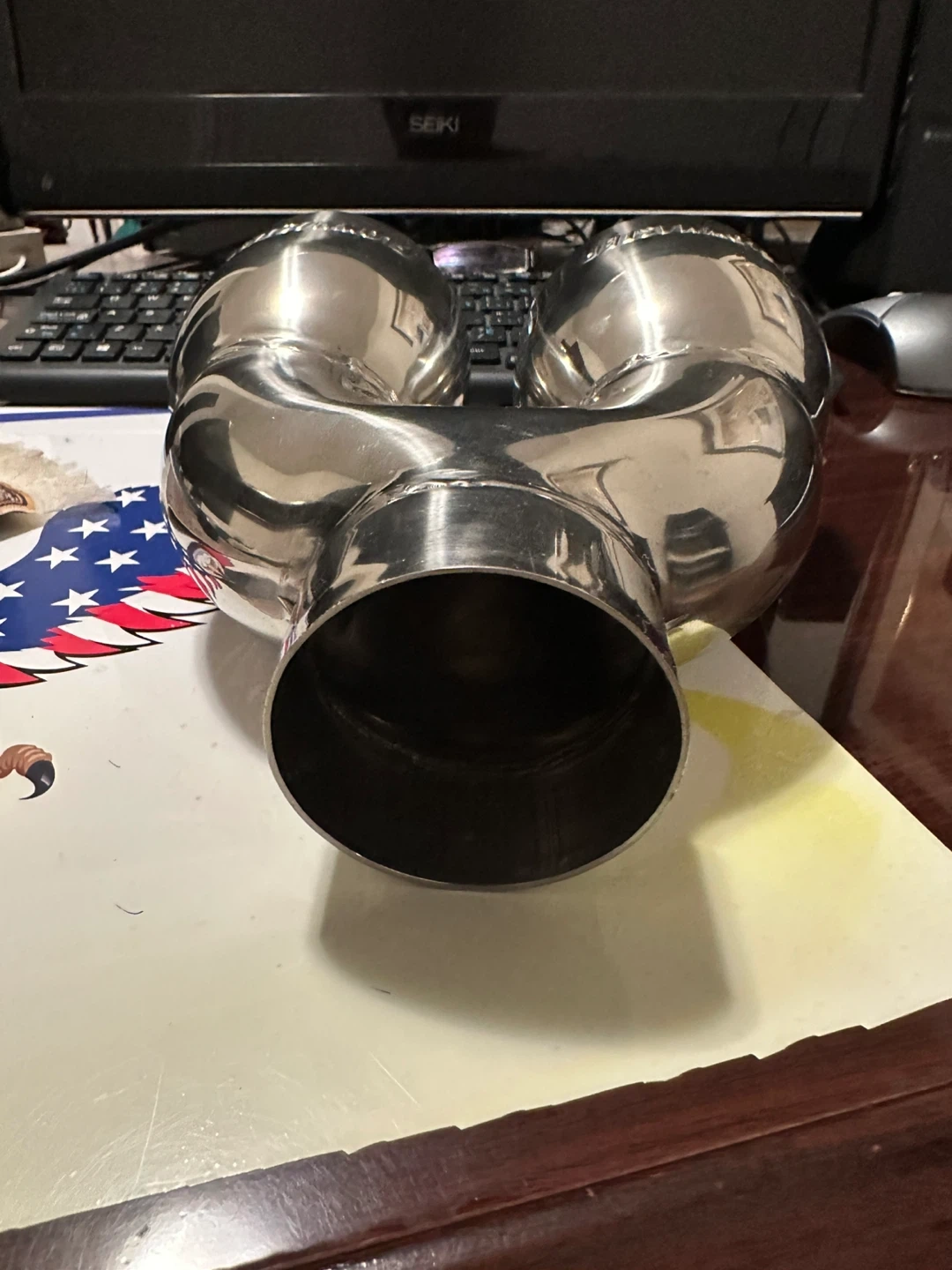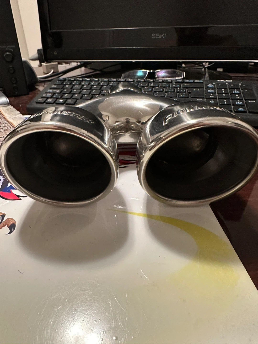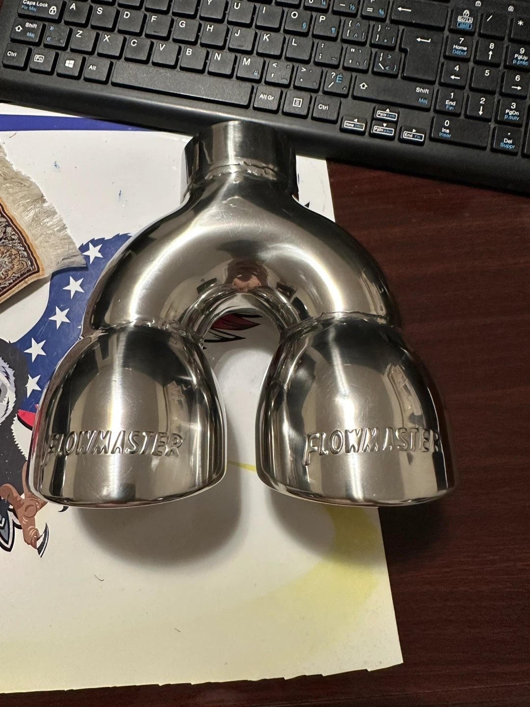 This is a Flowmaster exhaust tip with a Y-pipe design. It's made of polished stainless steel. This tip would be useful for customizing a vehicle's exhaust system.