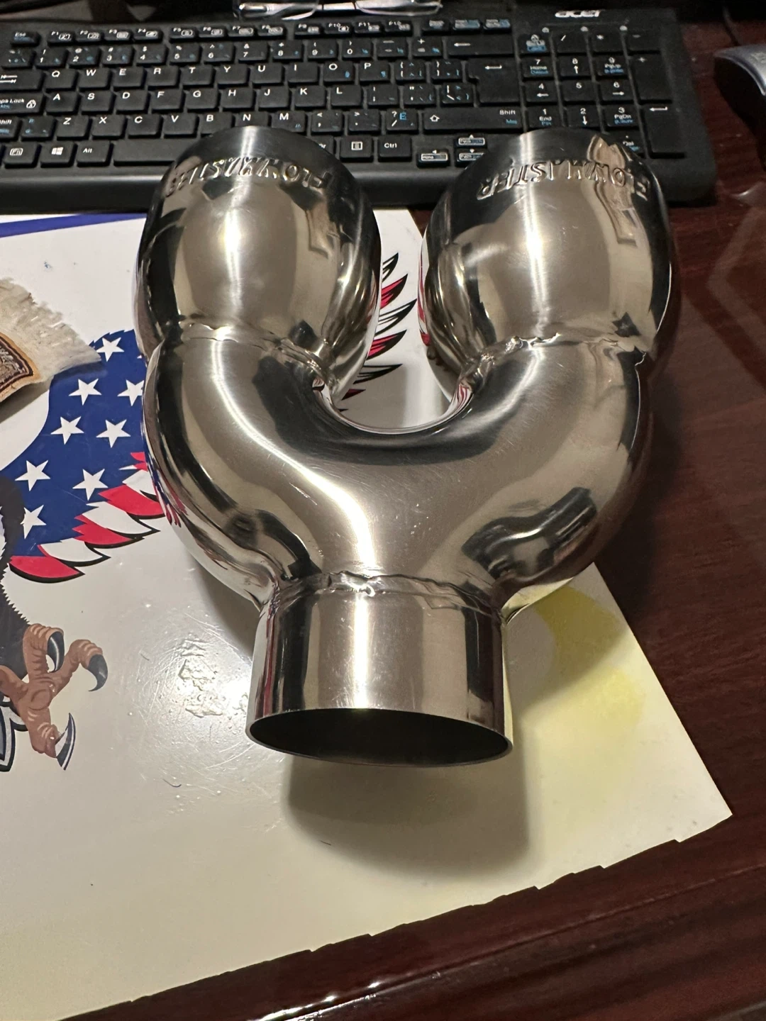 This is a Flowmaster exhaust tip with a Y-pipe design. It's made of polished stainless steel. This tip would be useful for customizing a vehicle's exhaust system.