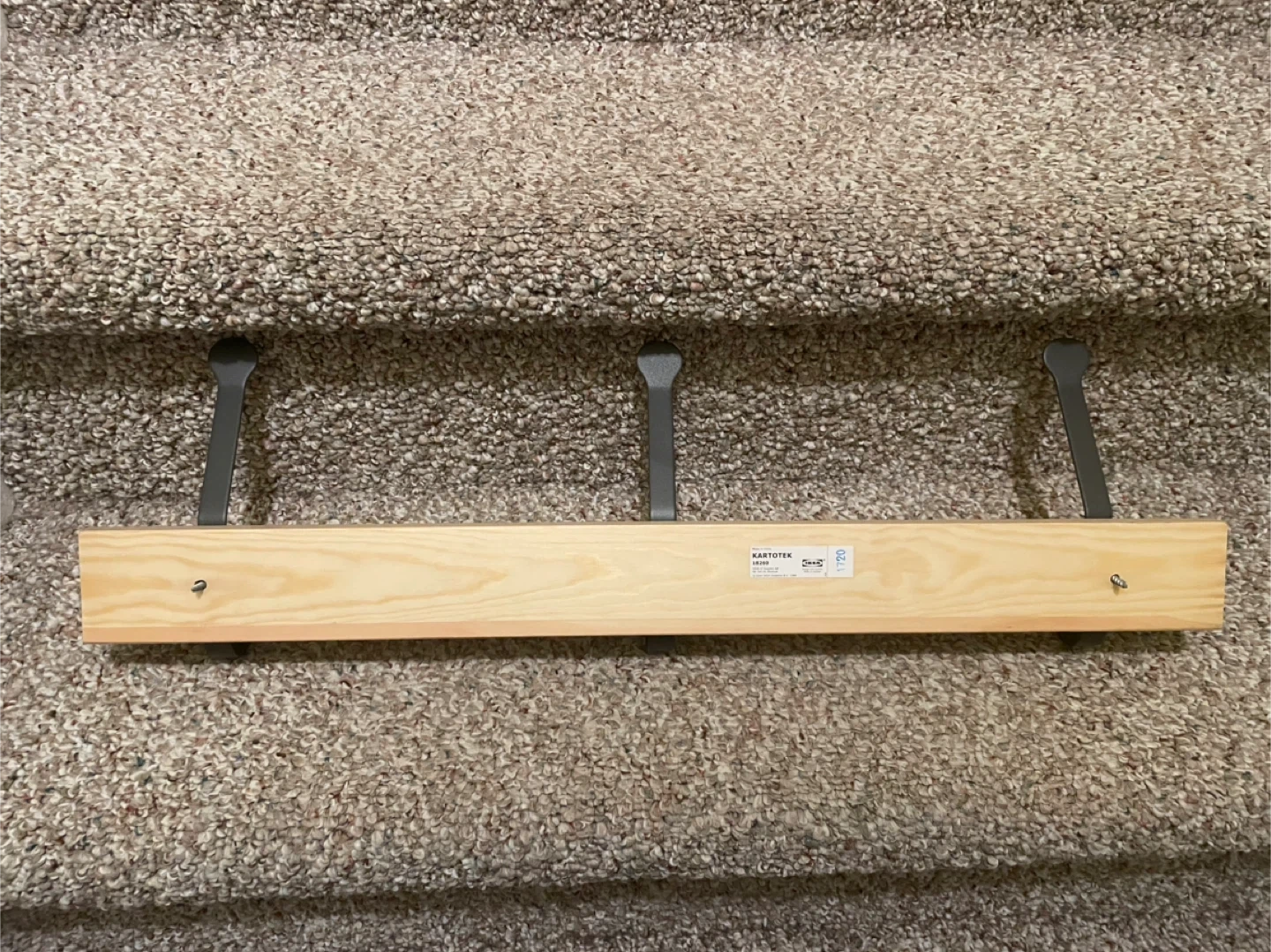 IKEA KARTOTEK wall mounted coat rack with three hooks. Features a natural wood backing and dark metal hooks. Simple and functional design for any entryway.