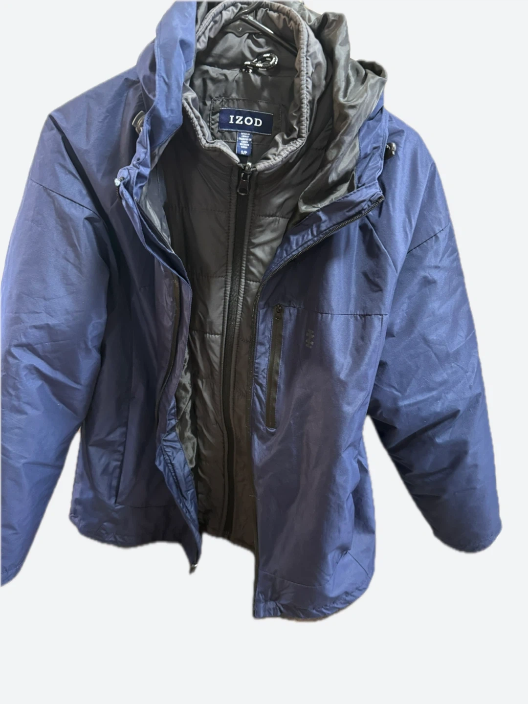 This is an IZOD hooded jacket in blue. It's a size S/P and made in China. It features a full zip front and a drawstring hood. (It has 2 jackets in 1 pack - (spring and winter and rain season