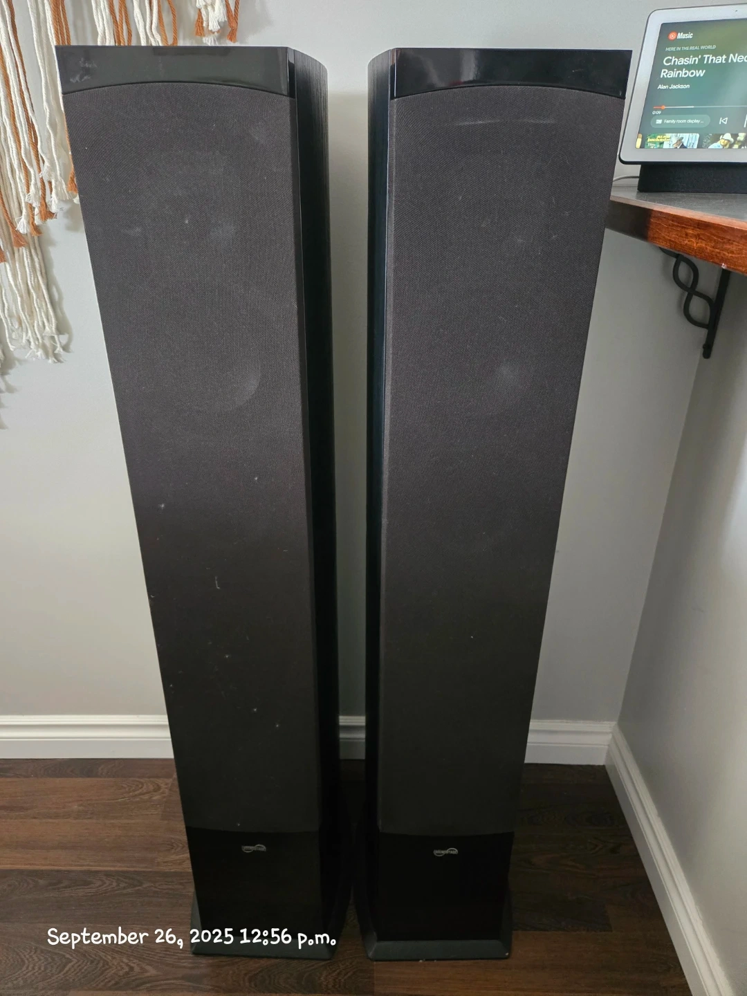 This set includes an Onkyo AV receiver and a pair of black Soundstage floor speakers, center channel and subwoofer. The receiver has HDMI input. Speakers are black and feature a fabric grille.
