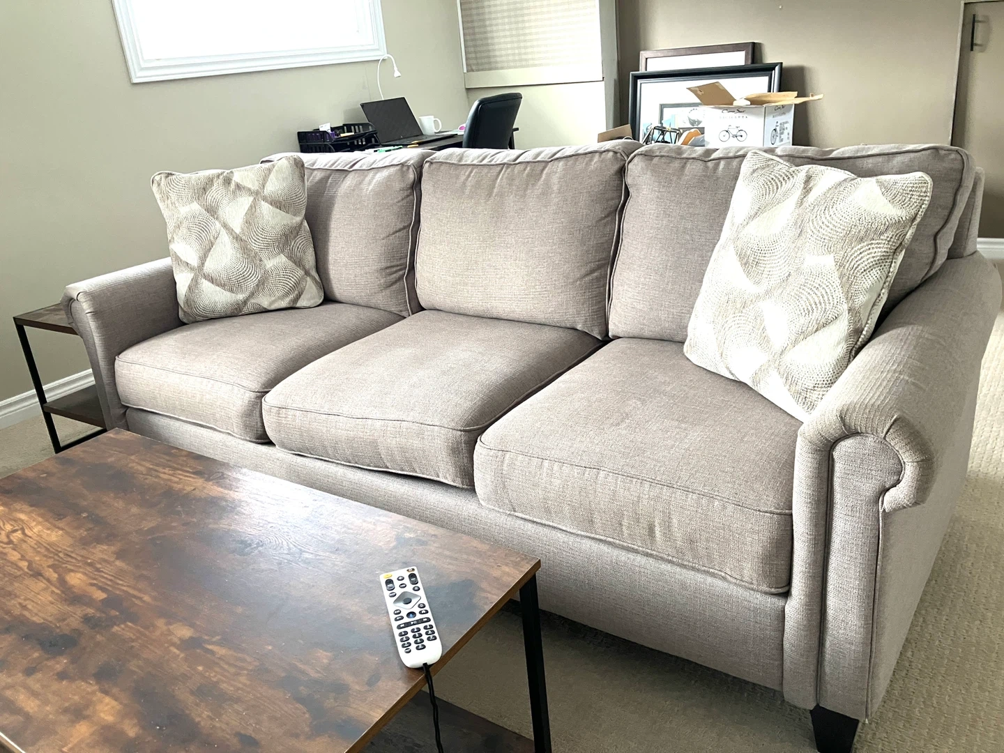 Owned for 3 years, scotchguarded, taken very good care was in rec room