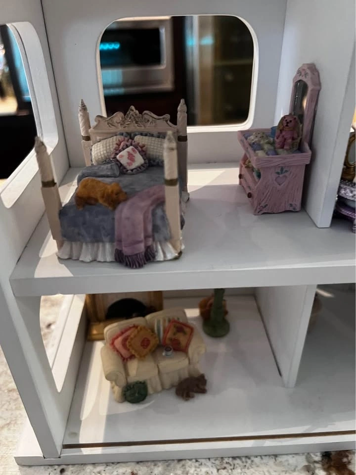 This is a very rare Vintage Avon Dollhouse, produced between 2000 and 2008. It comes with all 20 pieces of miniature furniture shown in the picture. The furniture pieces are made of solid resin, giving most of them a substantial weight, though some pieces are more delicate.