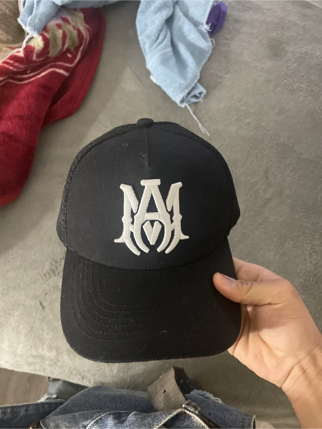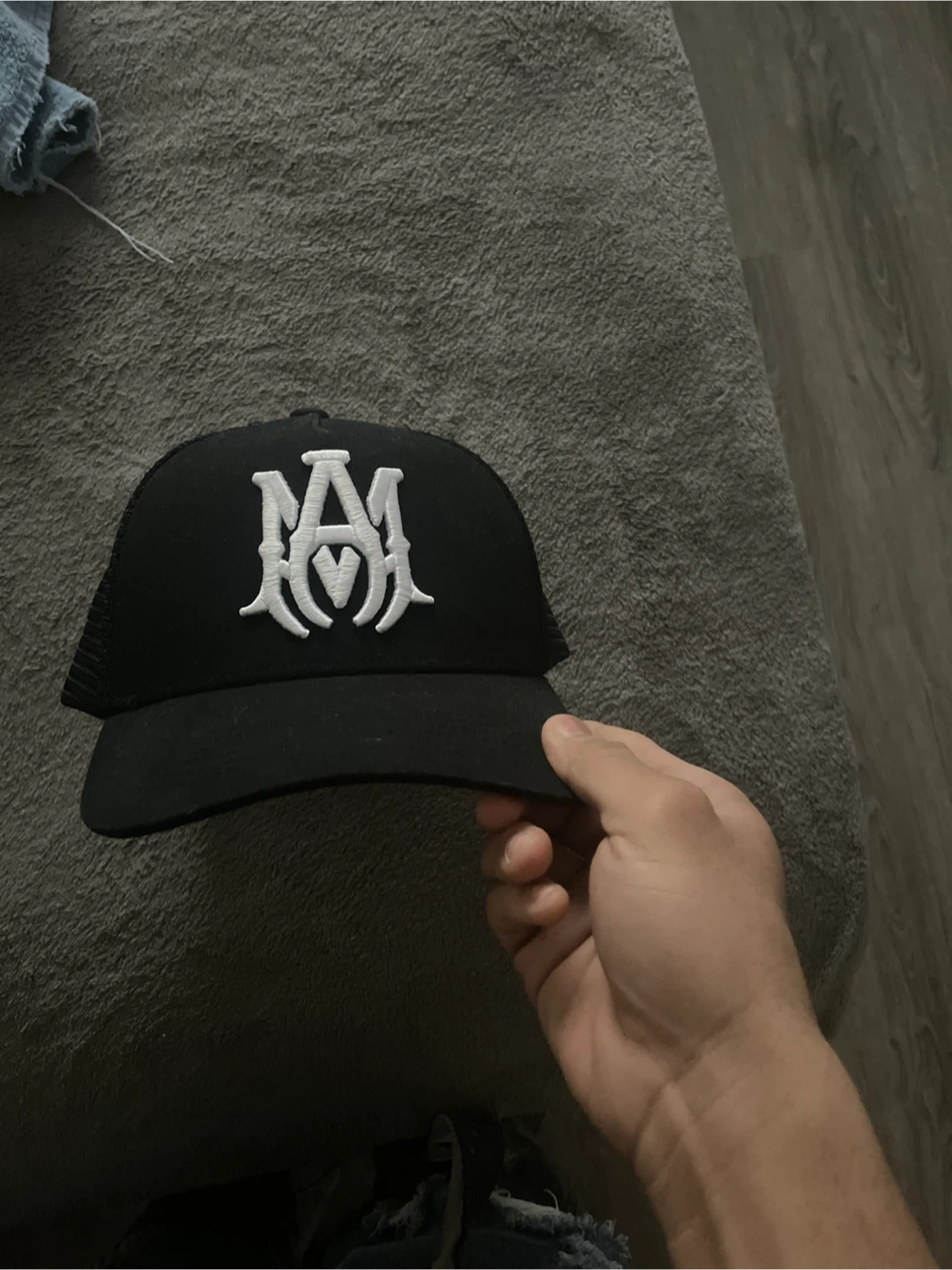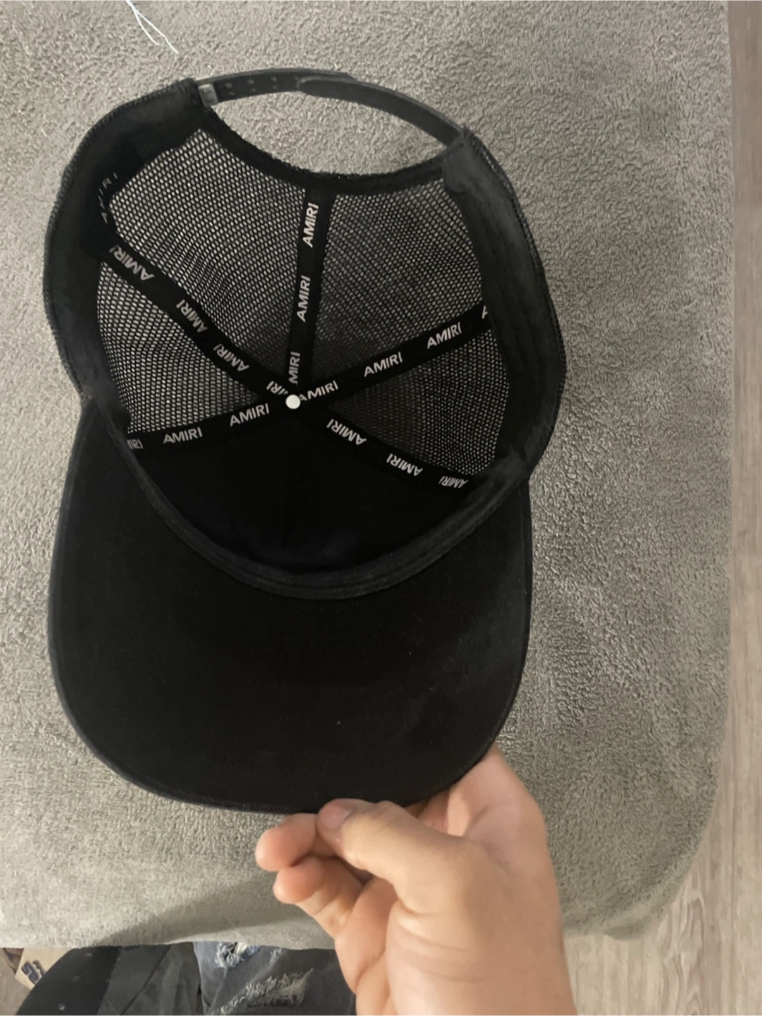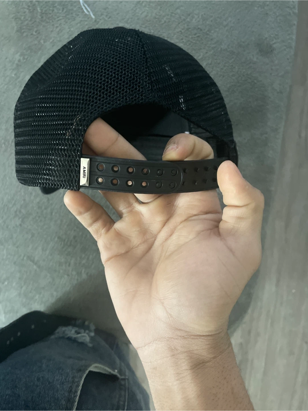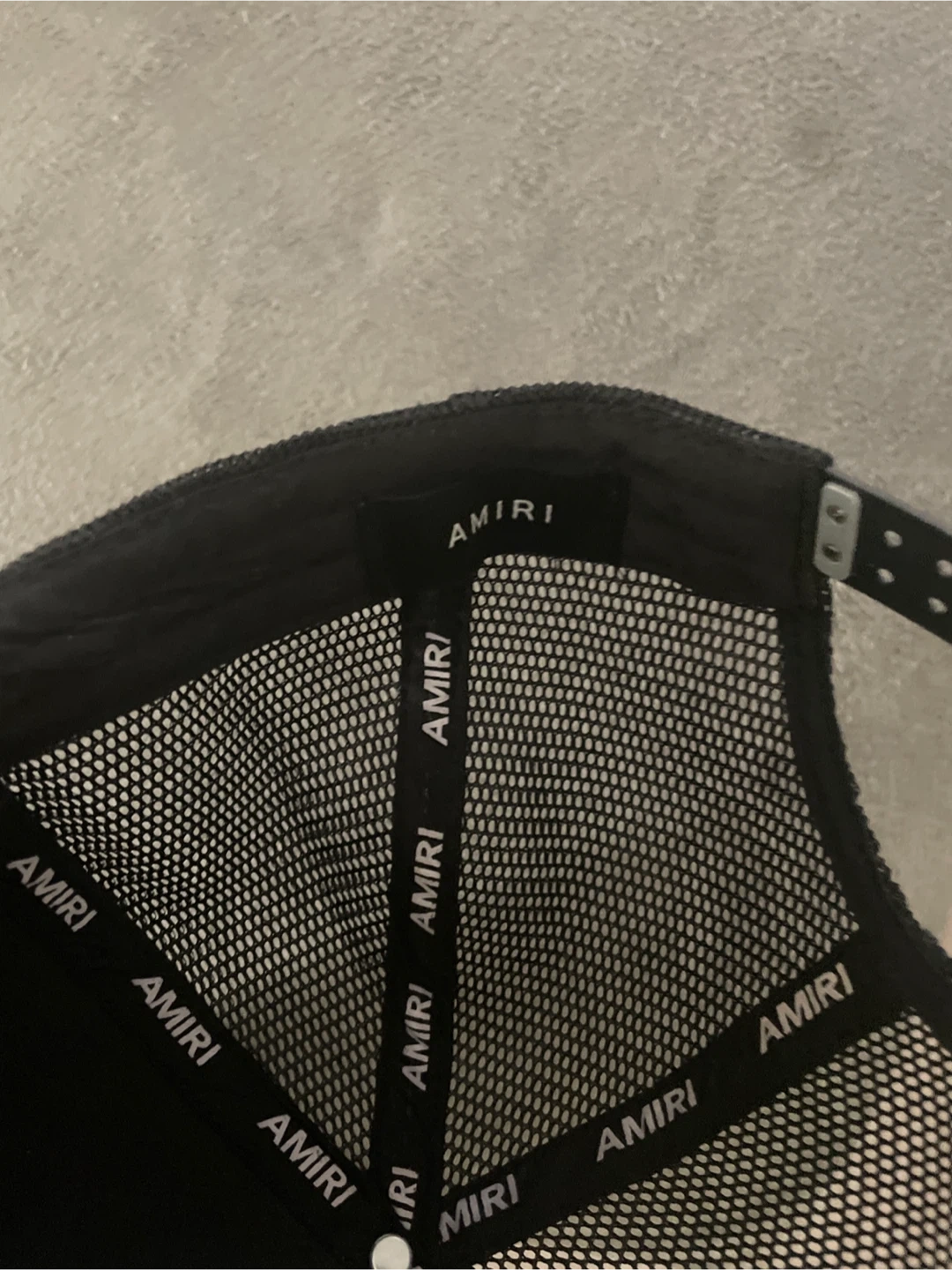 This Amiri trucker hat is black with a white logo on the front. It features a mesh back for breathability. Adjustable strap at the back for a custom fit