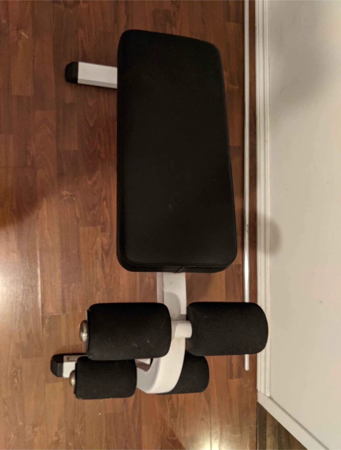 This workout bench features a padded seat and backrest for comfort during exercises. It has adjustable leg rollers for securing your position. It's made with a sturdy white frame and black padding.