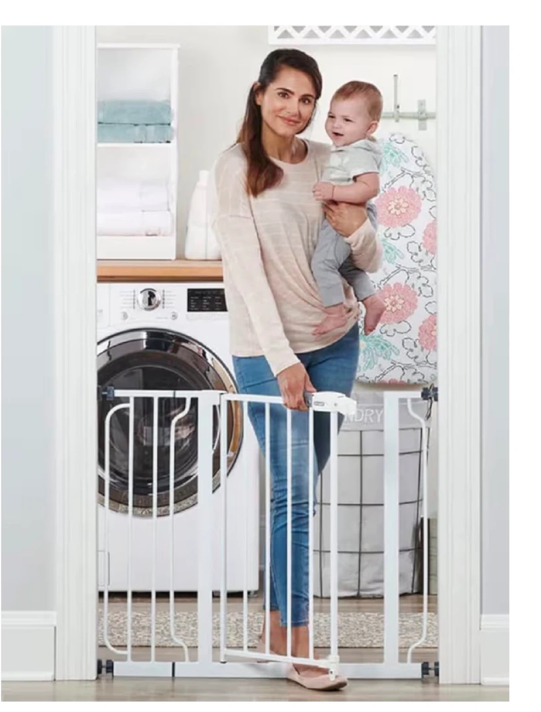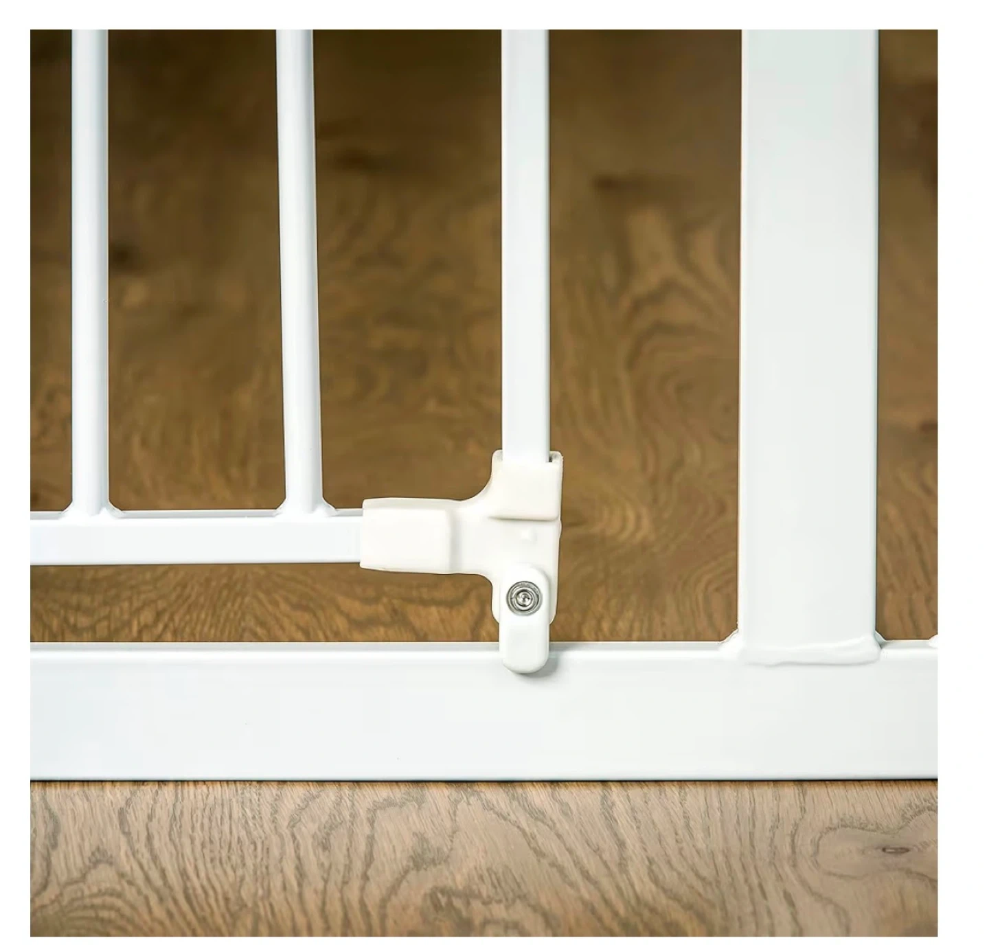 Pressure mounted baby gate by Regalo. It's white and includes all necessary hardware for installation. This gate's design is ideal for keeping little ones safe.