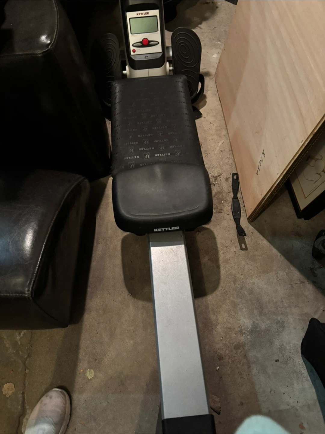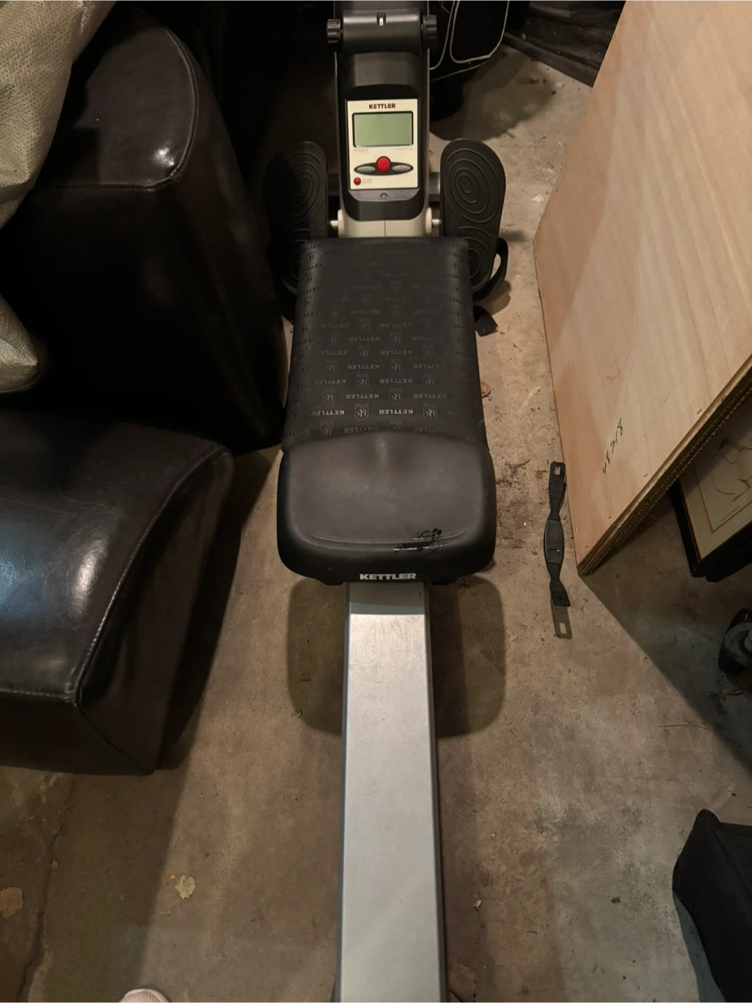 Kettler rowing machine with adjustable resistance levels. Features a digital display for tracking your workout metrics. Comfortable padded seat and foot straps.