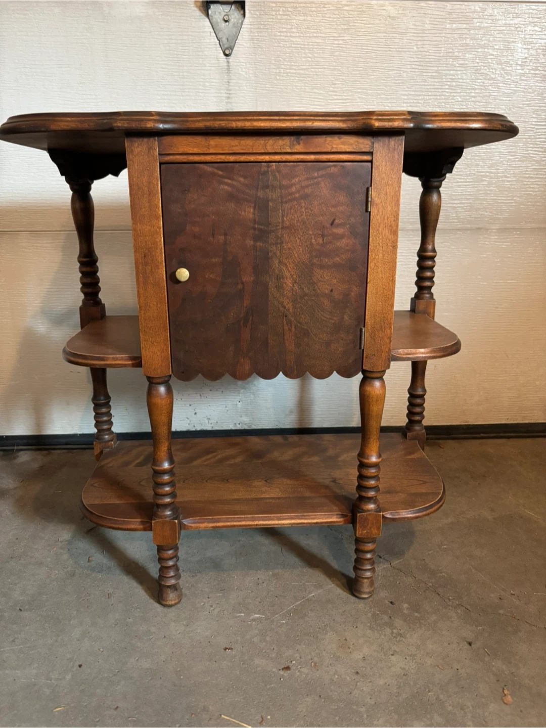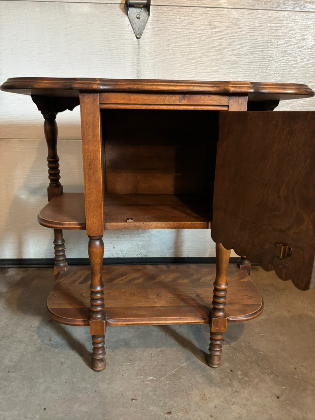 This is a charming vintage wooden side table. It features two open shelves and a small cabinet for storage. The wood has a lovely warm tone and a classic design.