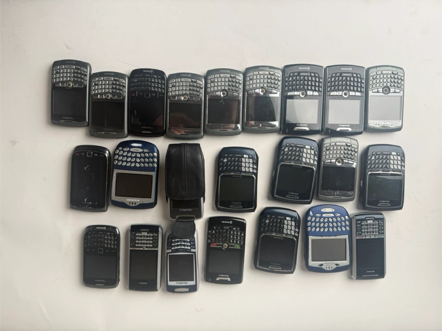 A collection of BlackBerry mobile phones. Includes various models and colours. Some appear to be older models with full QWERTY keyboards. One phone comes with a leather case.