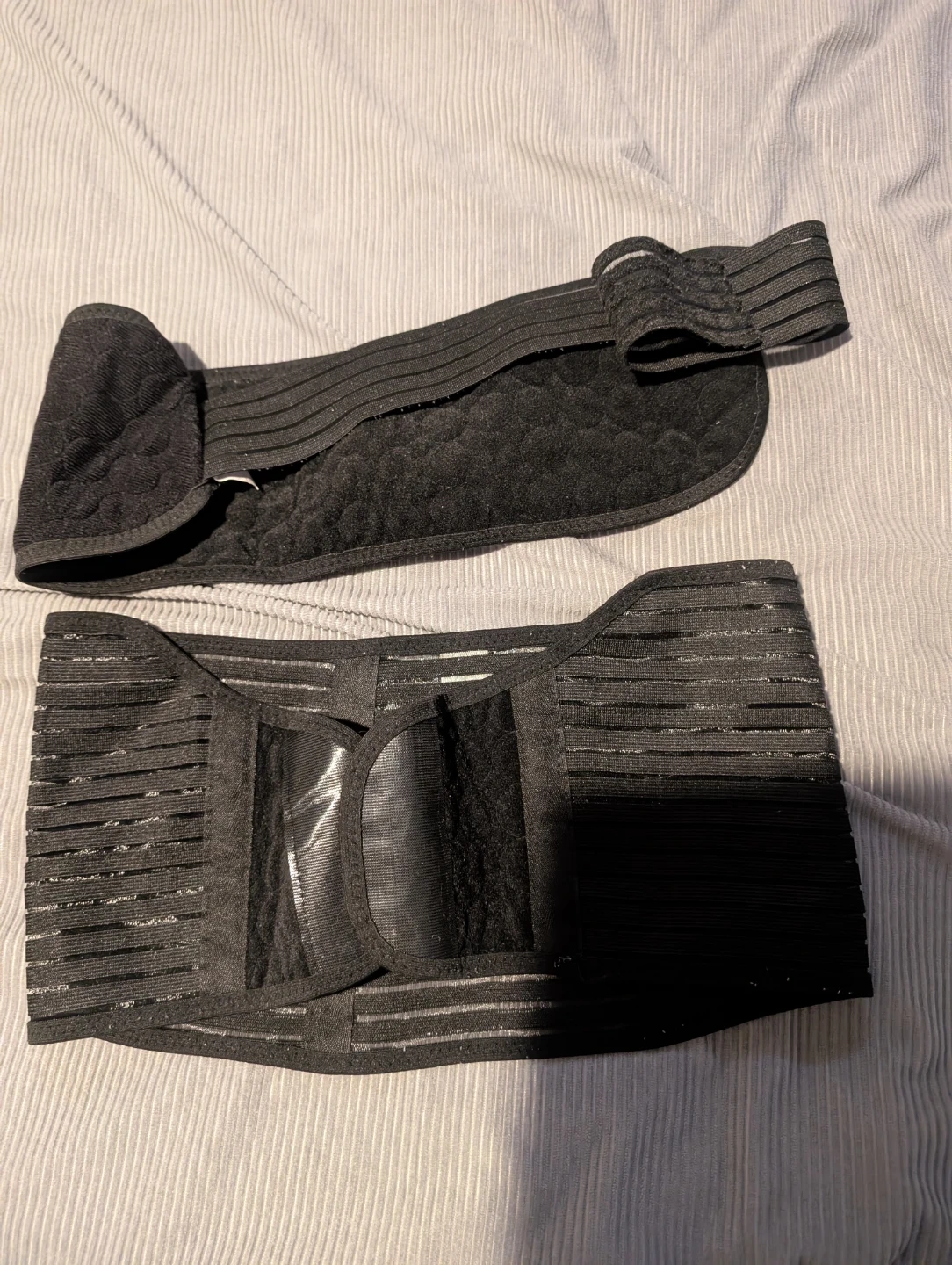 Set of two black back support braces. One brace features a quilted design and the other is made with breathable mesh and adjustable straps. Both are crafted from elastic material for a comfortable, secure fit. The lower support is specially designed for pregnancy to help support your baby bump and reduce pressure, helping prevent pelvic and lower back pain while providing everyday comfort.