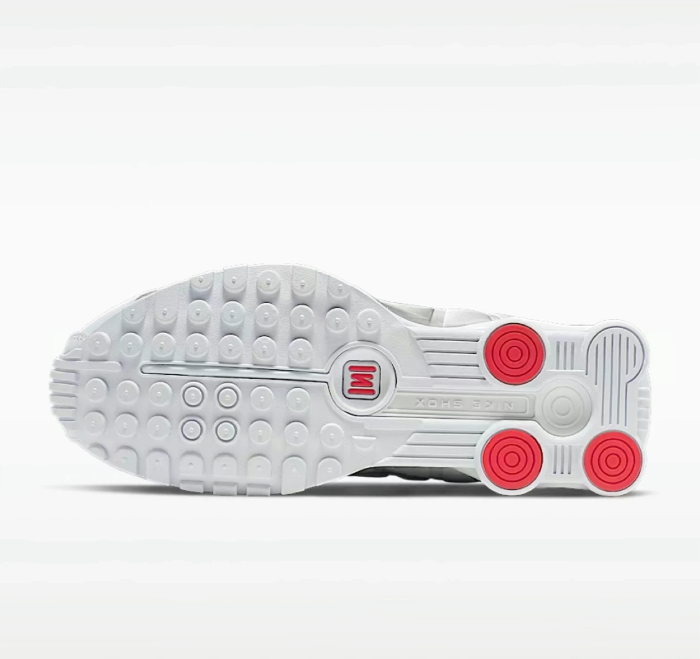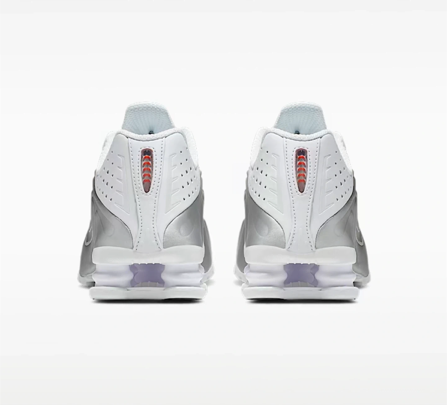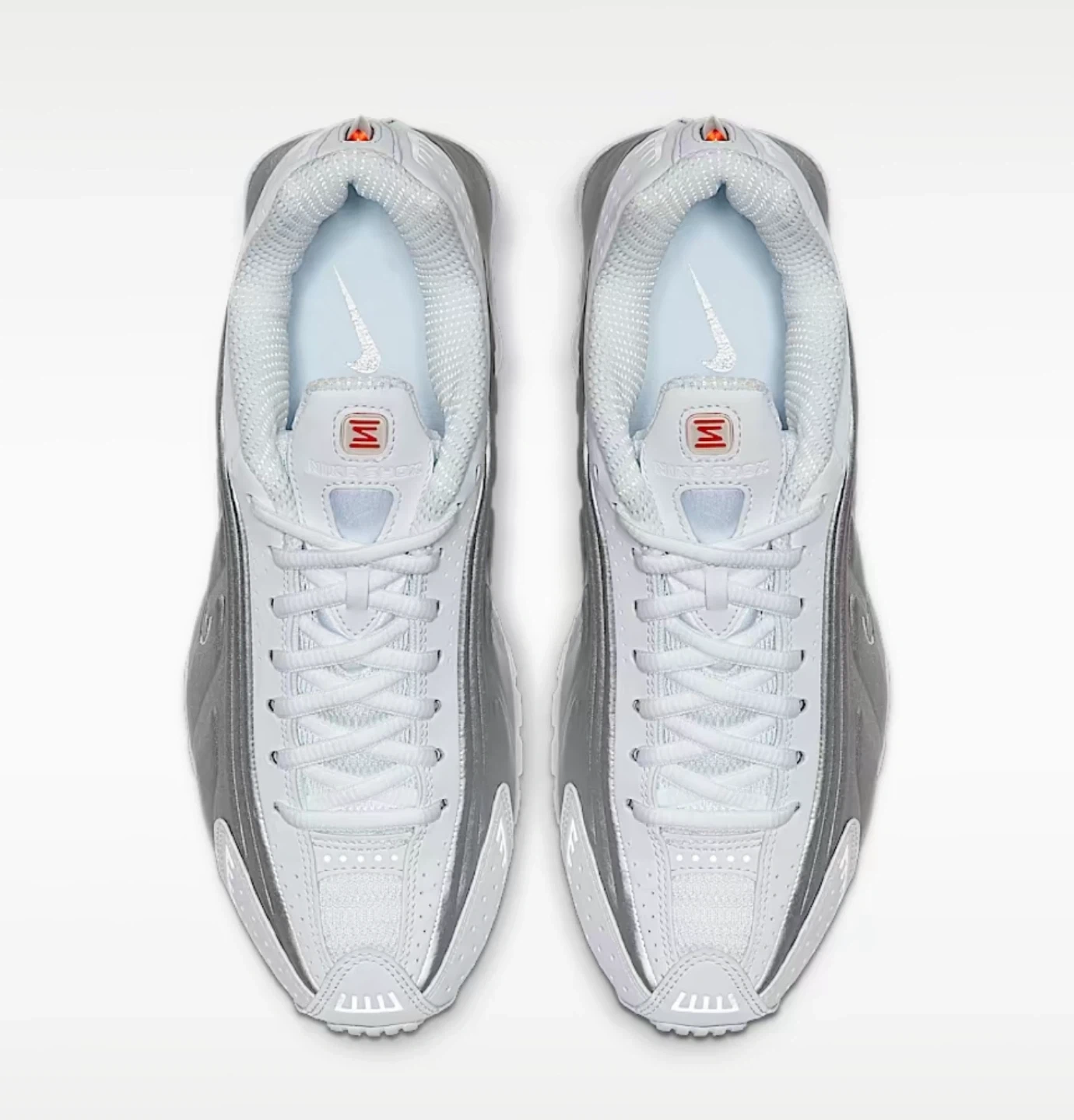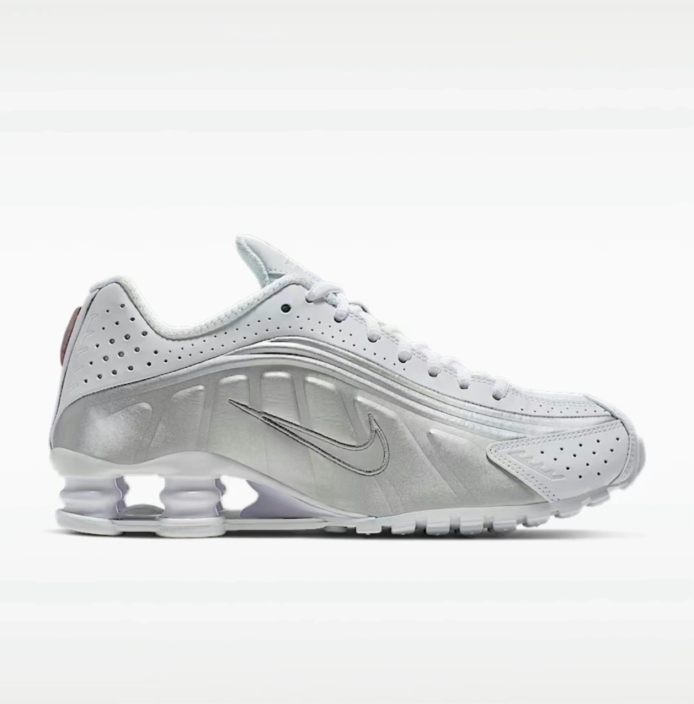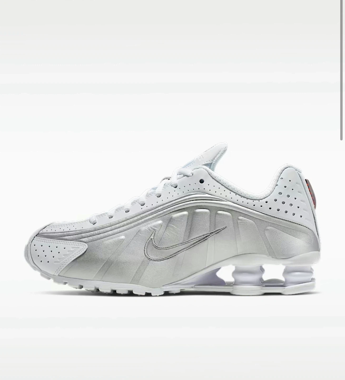 Nike Shox TL sneakers in white and silver. These shoes feature the distinctive Shox cushioning system. Leather and synthetic upper with perforated details. Rubber outsole. (WITHOUT THE BOX)