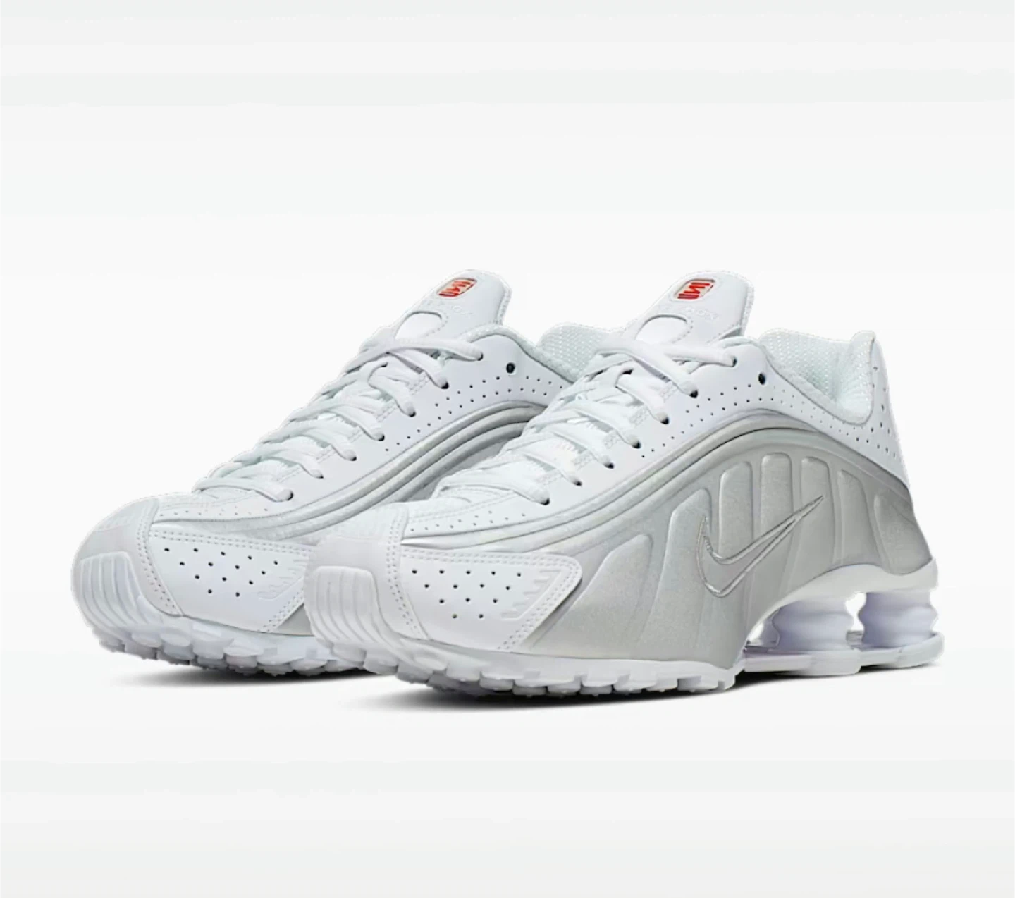 Nike Shox TL sneakers in white and silver. These shoes feature the distinctive Shox cushioning system. Leather and synthetic upper with perforated details. Rubber outsole. (WITHOUT THE BOX)