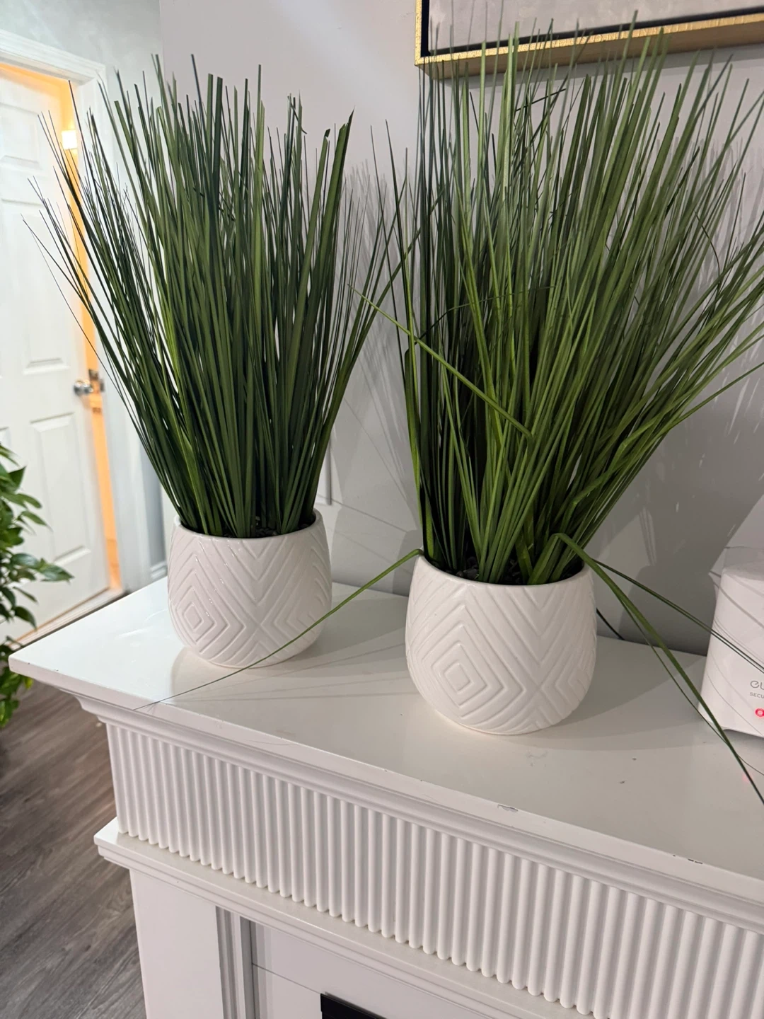 Two artificial grass plants in textured white ceramic pots. These pots have a geometric diamond pattern. They're great for adding greenery without any maintenance. The plants are made of plastic and sit in small black pebbles.