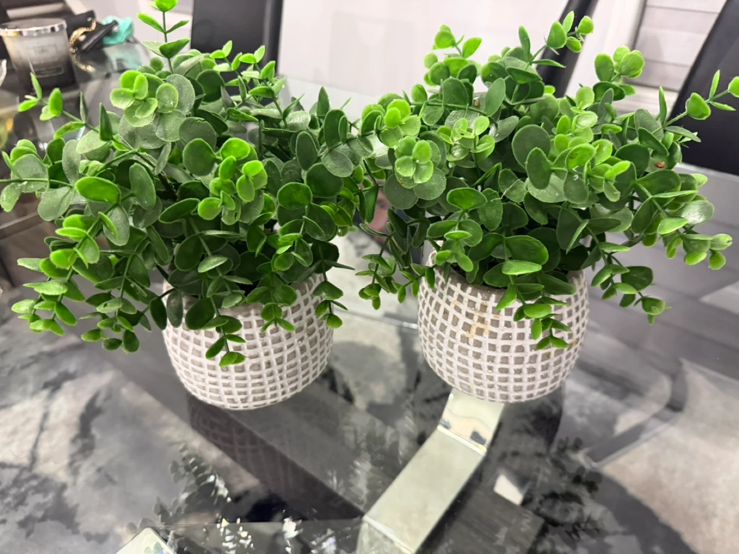 Two small artificial eucalyptus plants. Each plant is in a textured white pot. These are decorative items that don't require watering. Good for adding a touch of green to a space.