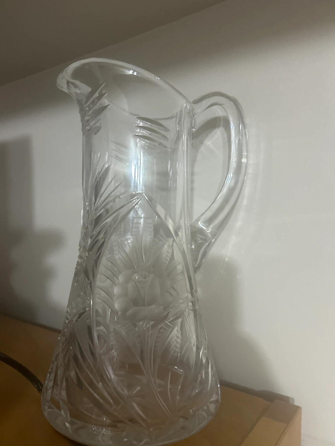 This is a beautiful clear glass pitcher with an etched floral design. It has a classic spout and a sturdy handle. Glass material.